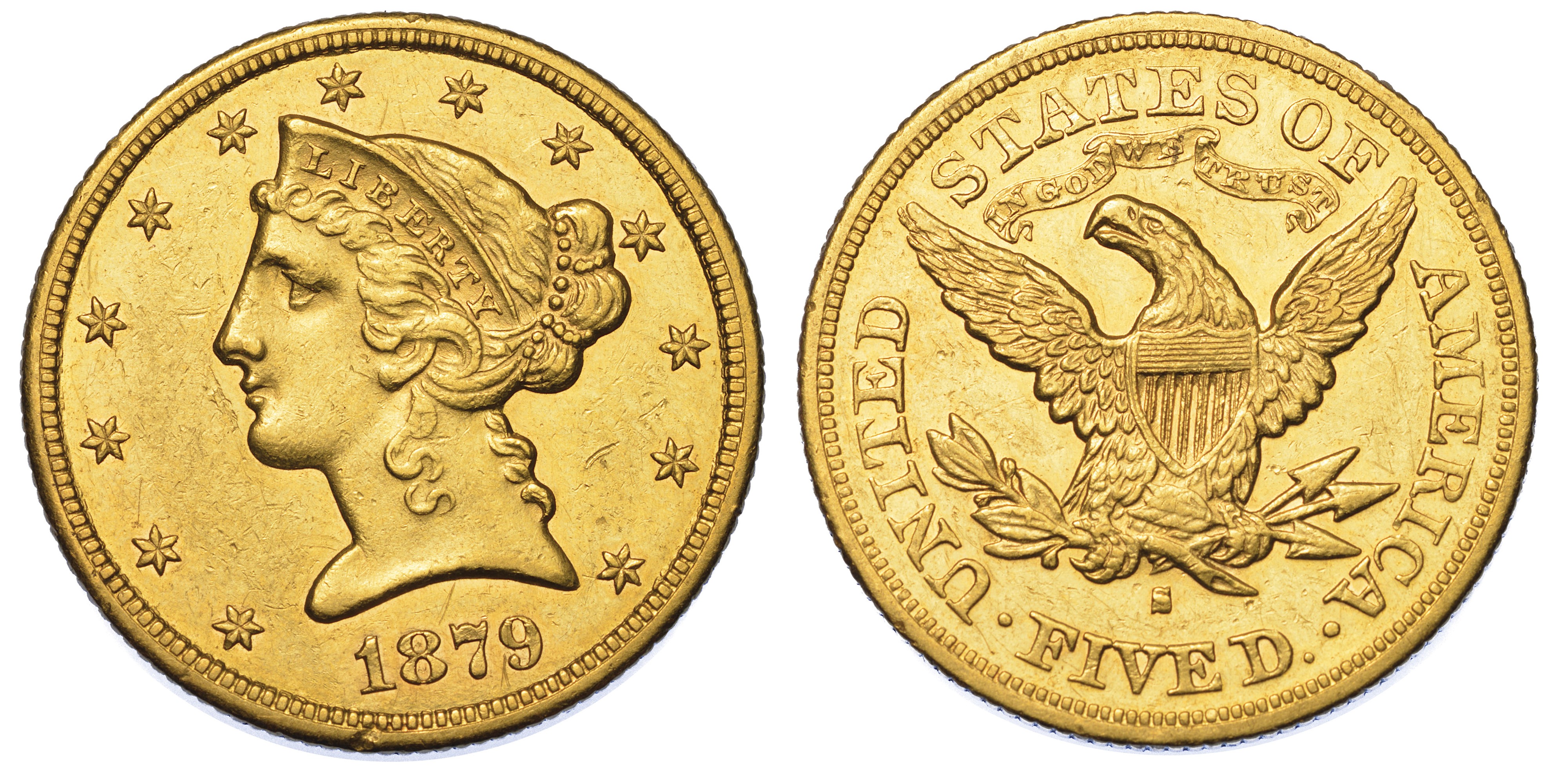 USA. REPUBLIC. 5 Dollars “Coronet Head” 1879. Zecca di San Francisco, California.