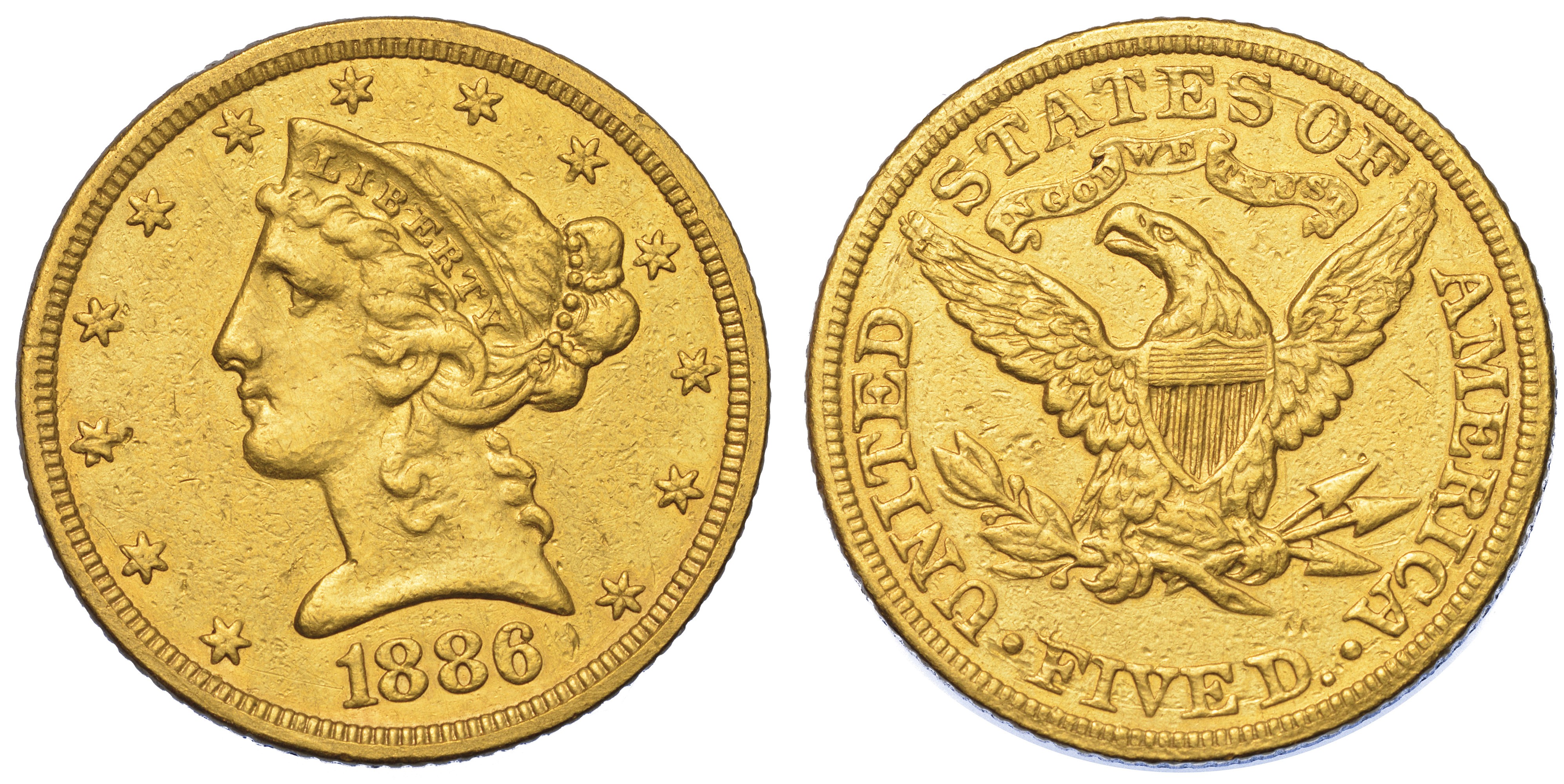 USA. REPUBLIC. 5 Dollars “Coronet Head” 1886. Zecca di Philadephia, Pennsylvania.
