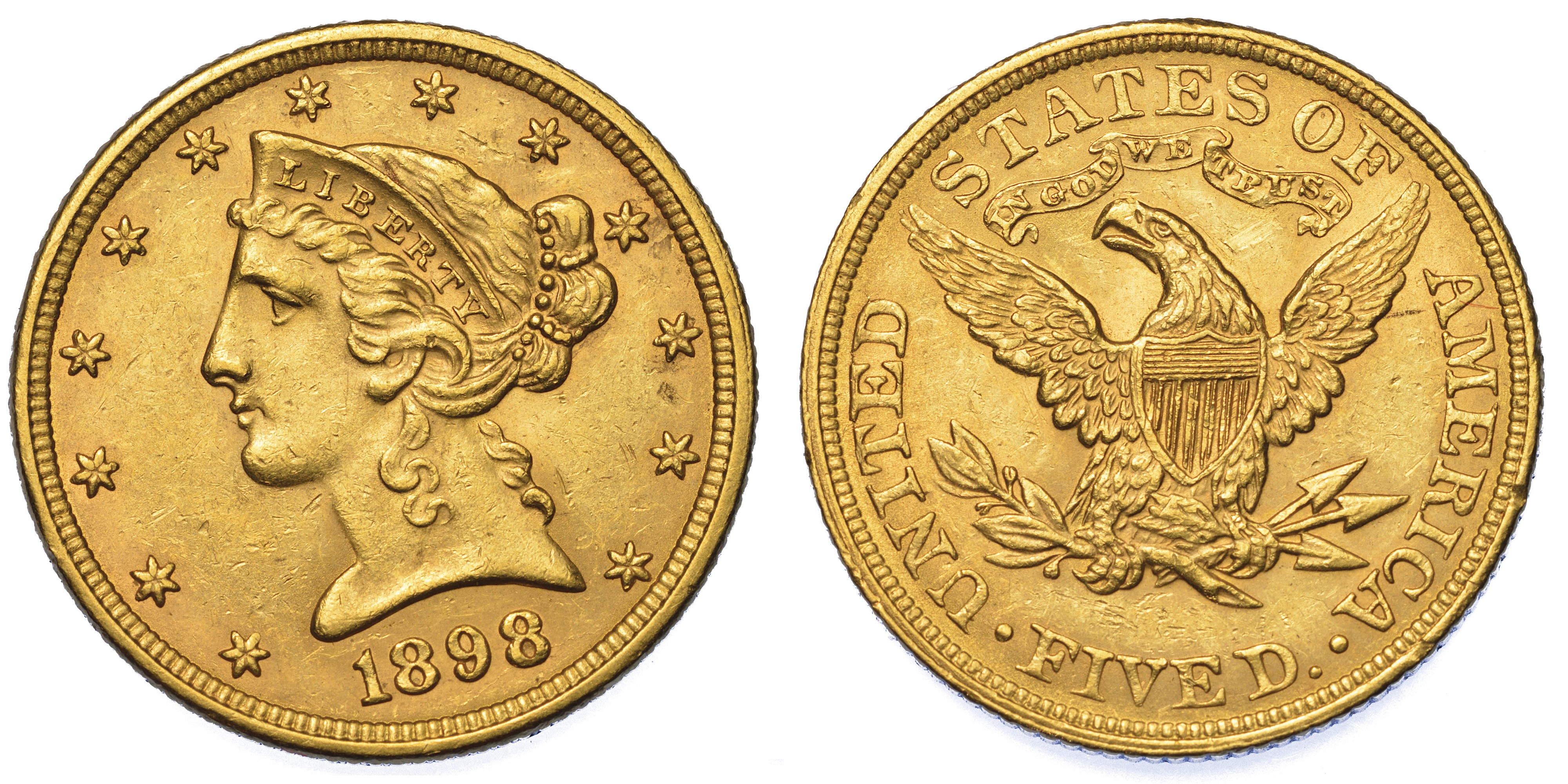 USA. REPUBLIC. 5 Dollars “Coronet Head” 1898. Zecca di Philadephia, Pennsylvania.