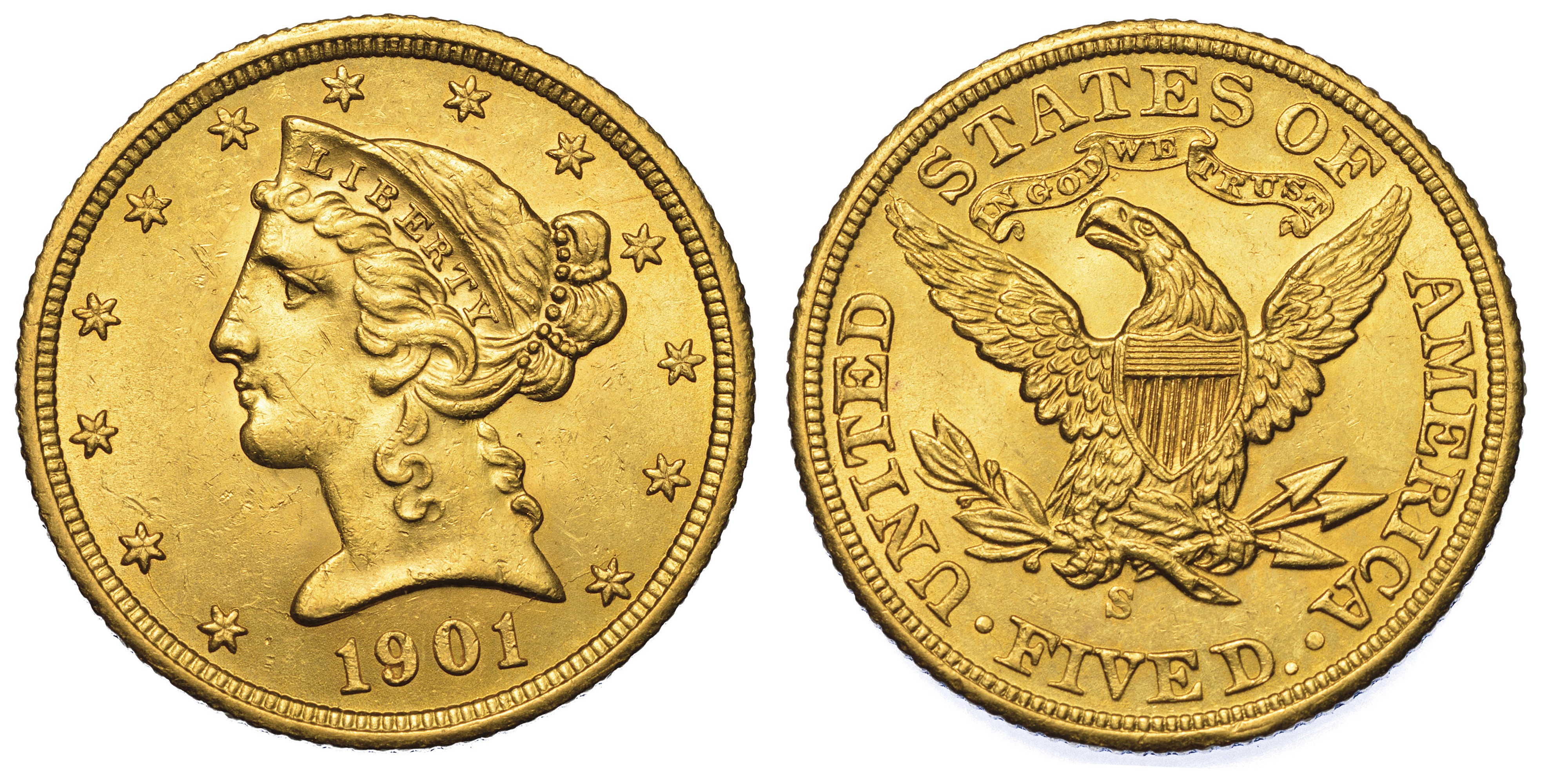 USA. REPUBLIC. 5 Dollars “Coronet Head” 1901. Zecca di San Francisco, California.
