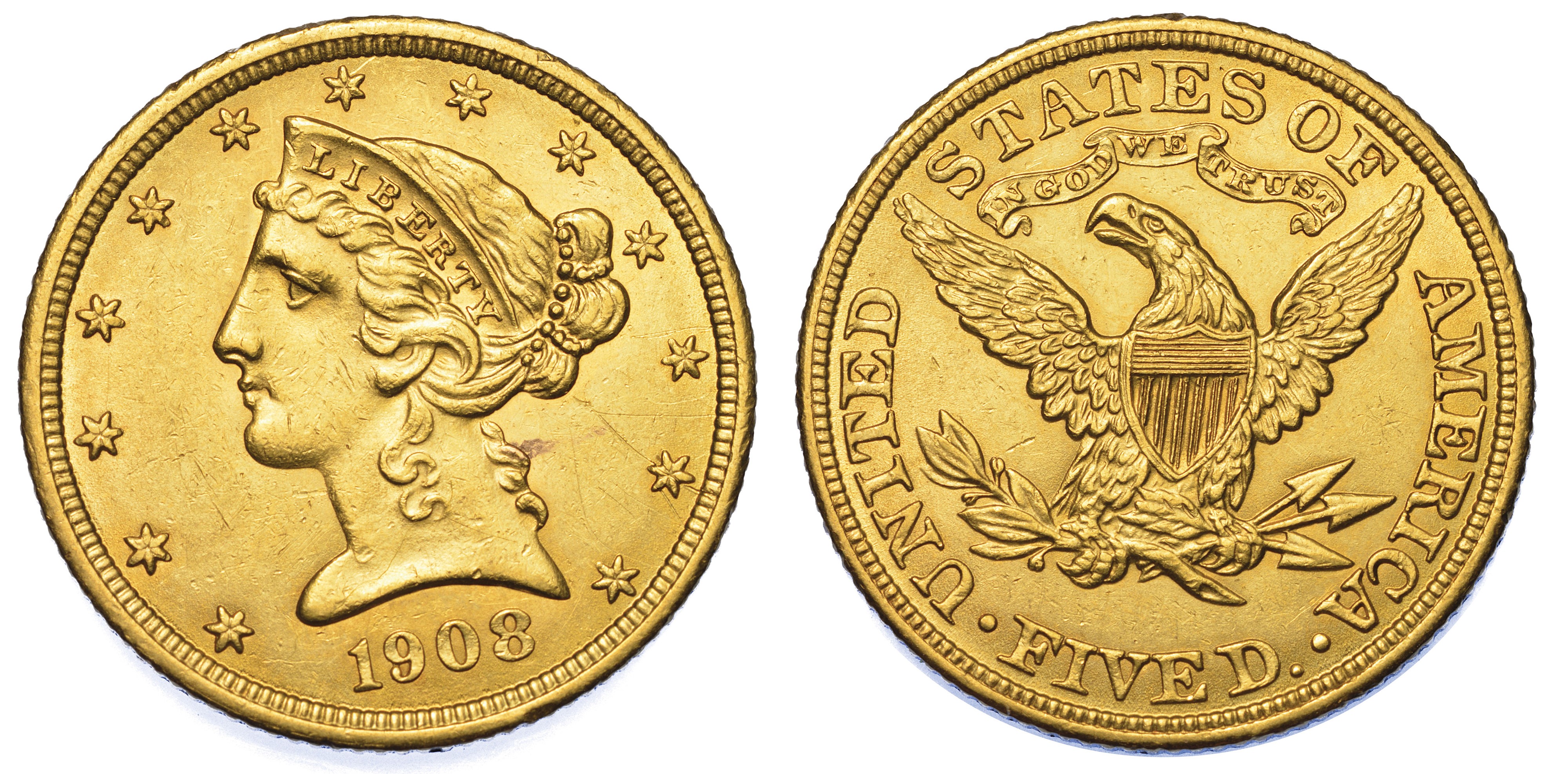 USA. REPUBLIC. 5 Dollars “Coronet Head” 1908. Zecca di Philadephia, Pennsylvania.