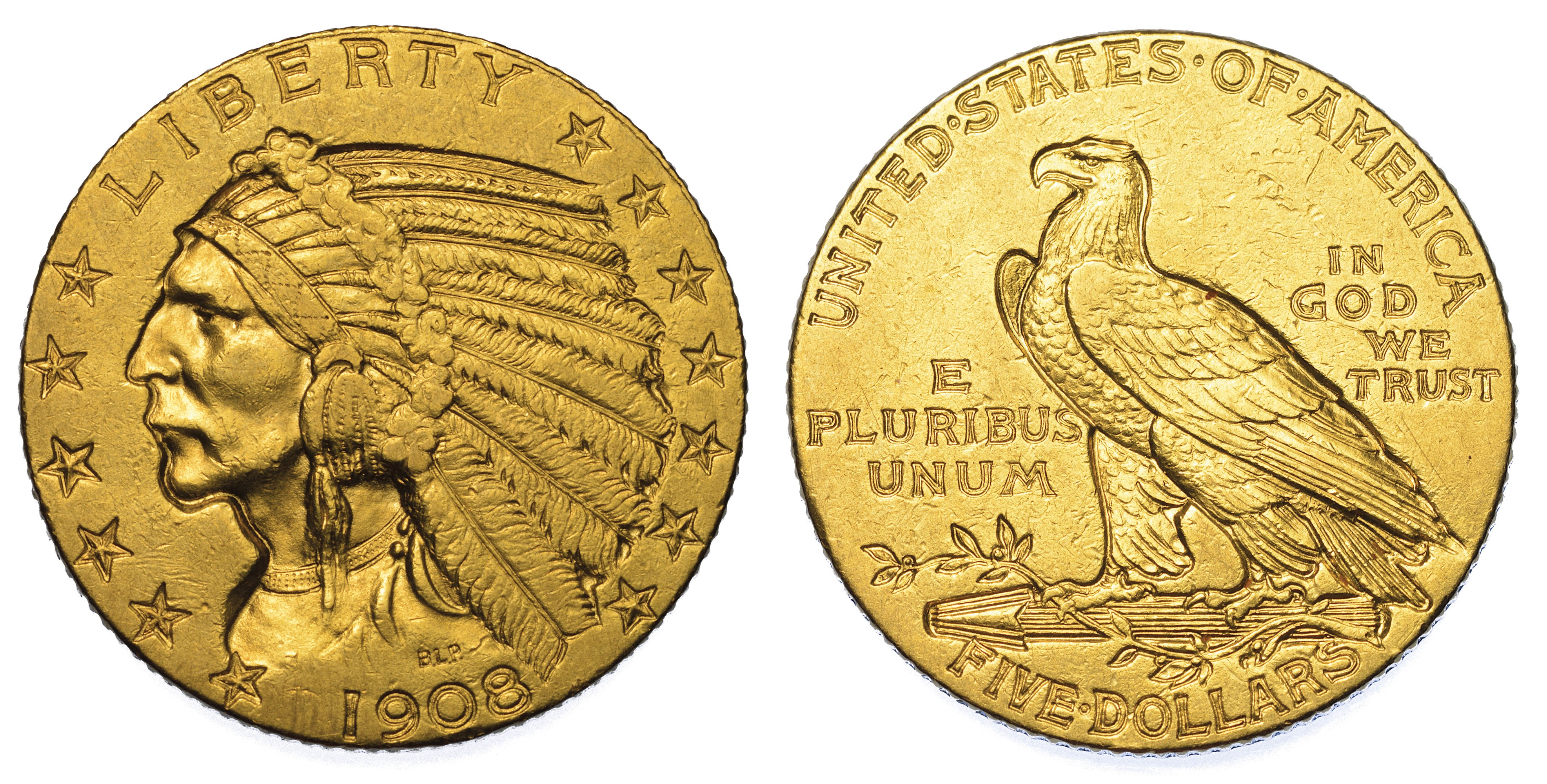 USA. REPUBLIC. 5 Dollars "Indian Head" 1908. Zecca di Philadephia, Pennsylvania.