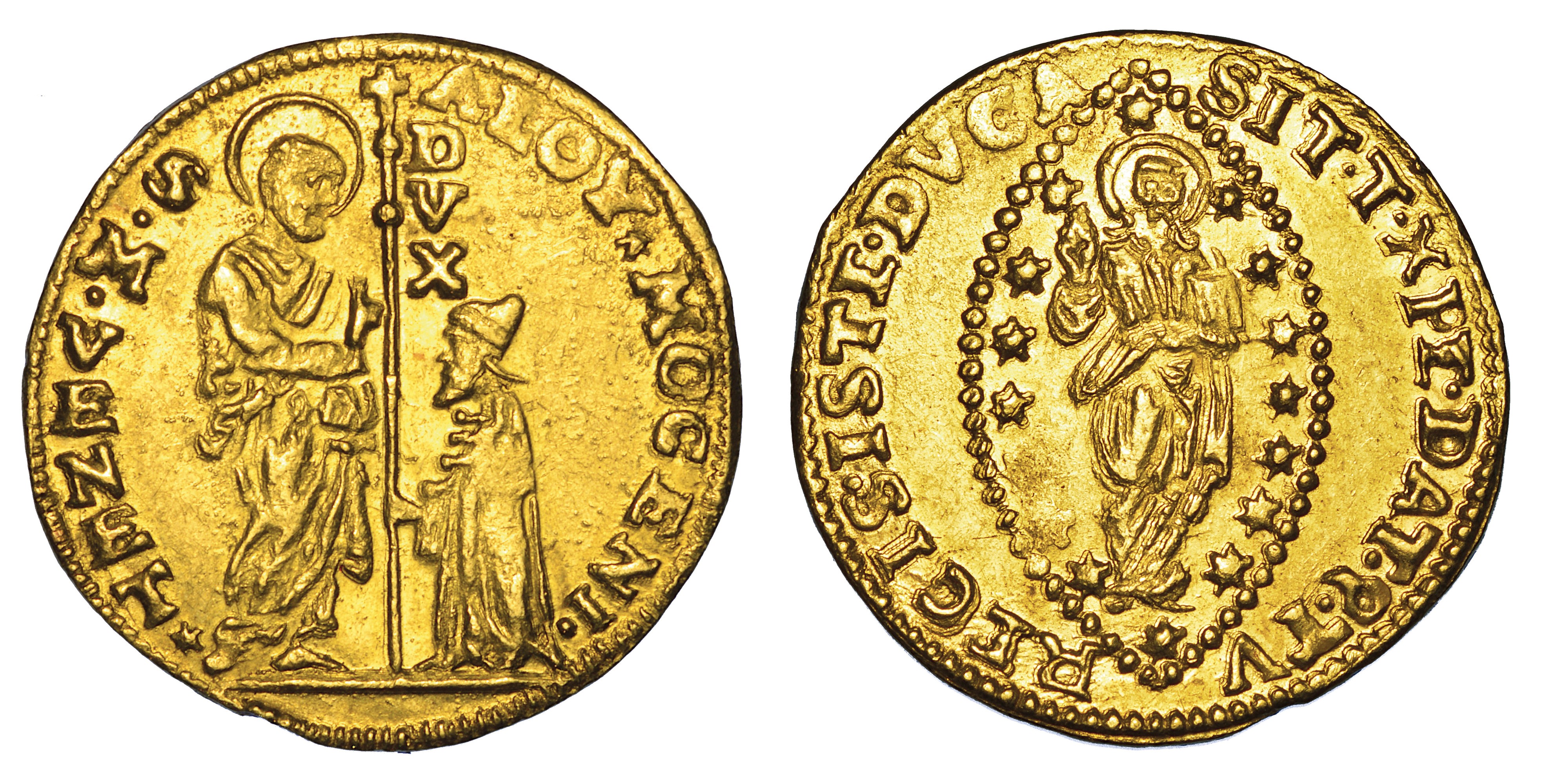 San Marco in piedi porge il vessillo al doge genuflesso. R/ Il Redentore in piedi in aureola ellittica. Paolucci 7. g. 3,48. Diam. mm. 21,53. Oro. BB/SPL