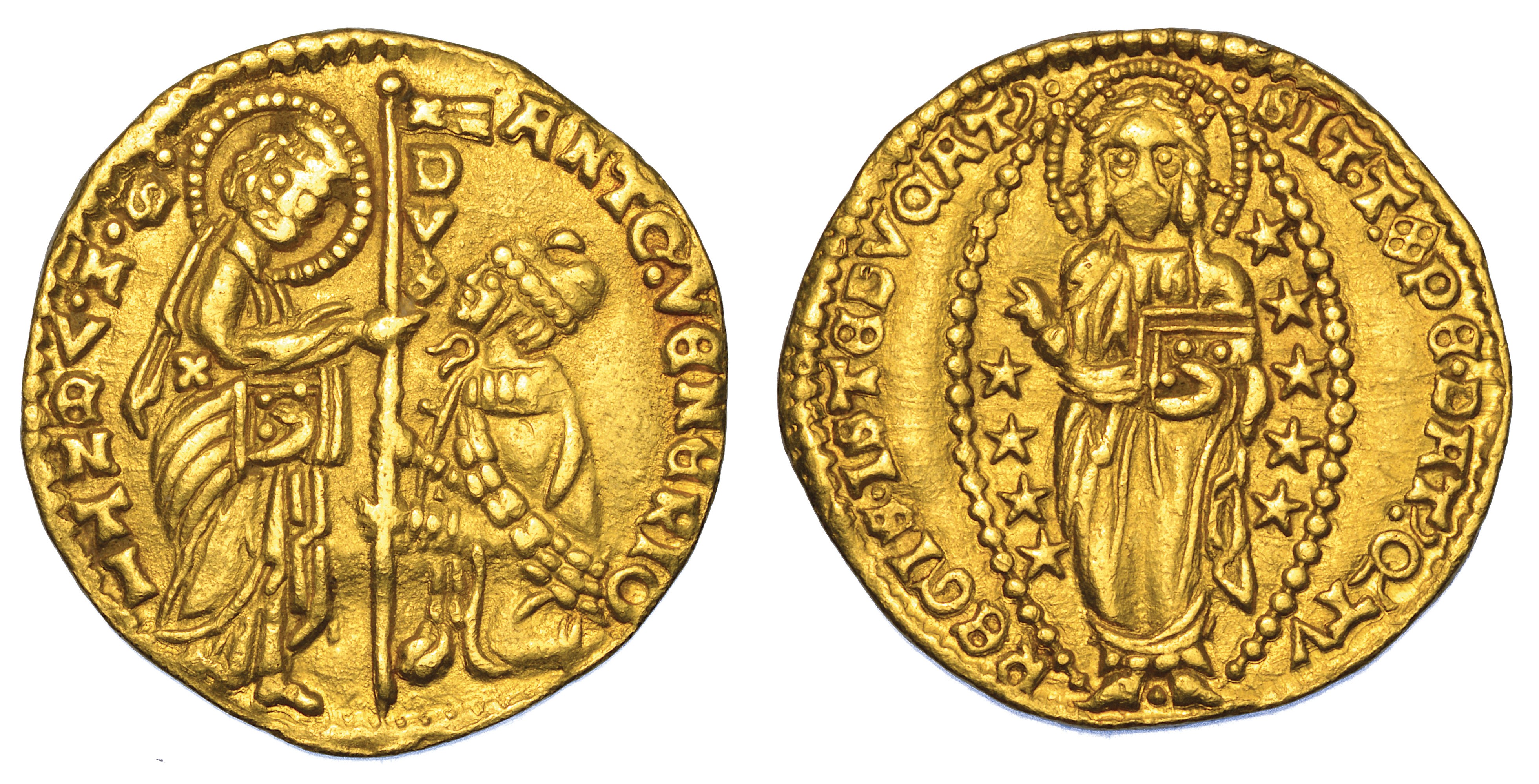 San Marco stante porge il vessillo al Doge genuflesso. R/ Il Redentore benedicente entro ellisse. Paolucci 1. g. 3,49. Diam. mm. 20,97. Oro. BB
