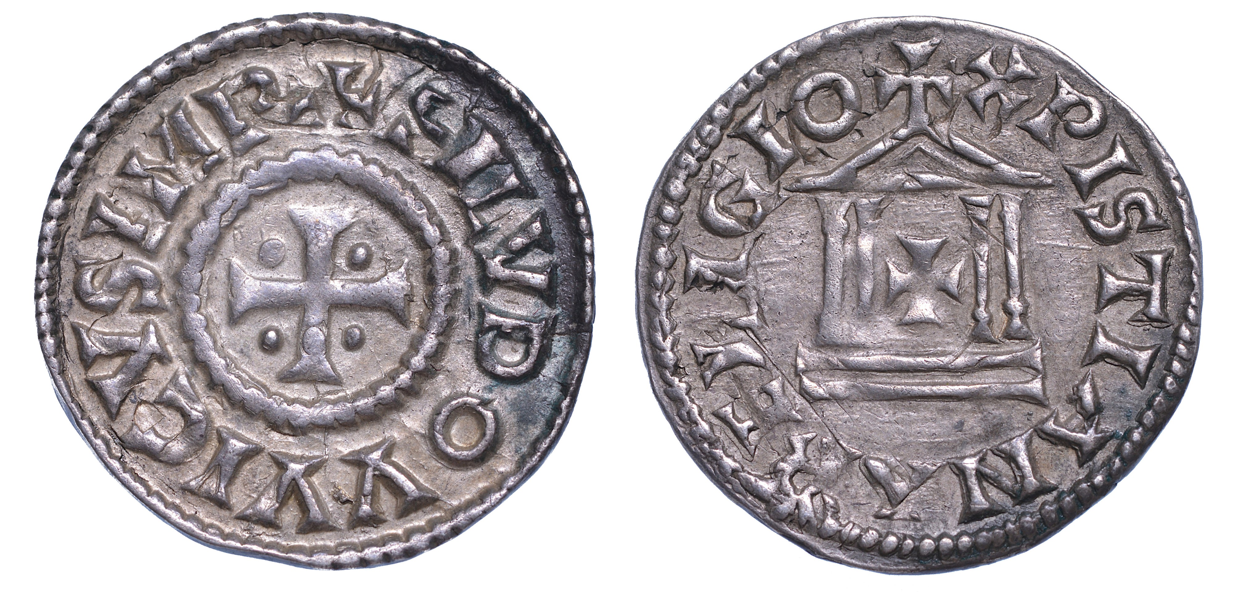 Croce patente accantonata da quattro globetti. R/ + XPISTIANA RELIGIO Tempio tetrastilo con croce nel mezzo. Crippa pag. 78-79. MEC 1, 1007. MIR 9. g. 1,76. Diam. mm. 19,60. Arg. Tracce di ribattitura. q.SPL