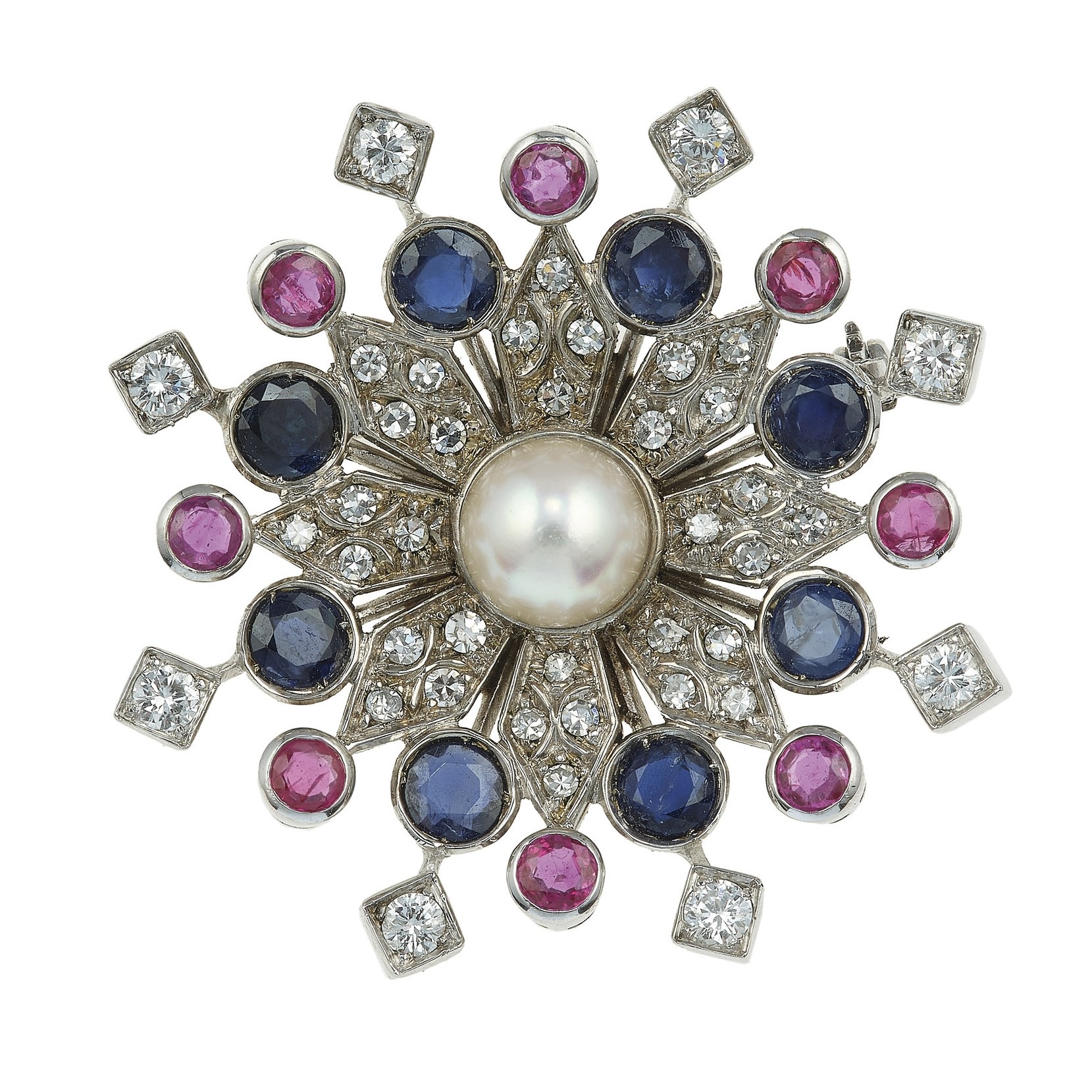 Sapphire, ruby, diamond and pearl brooch