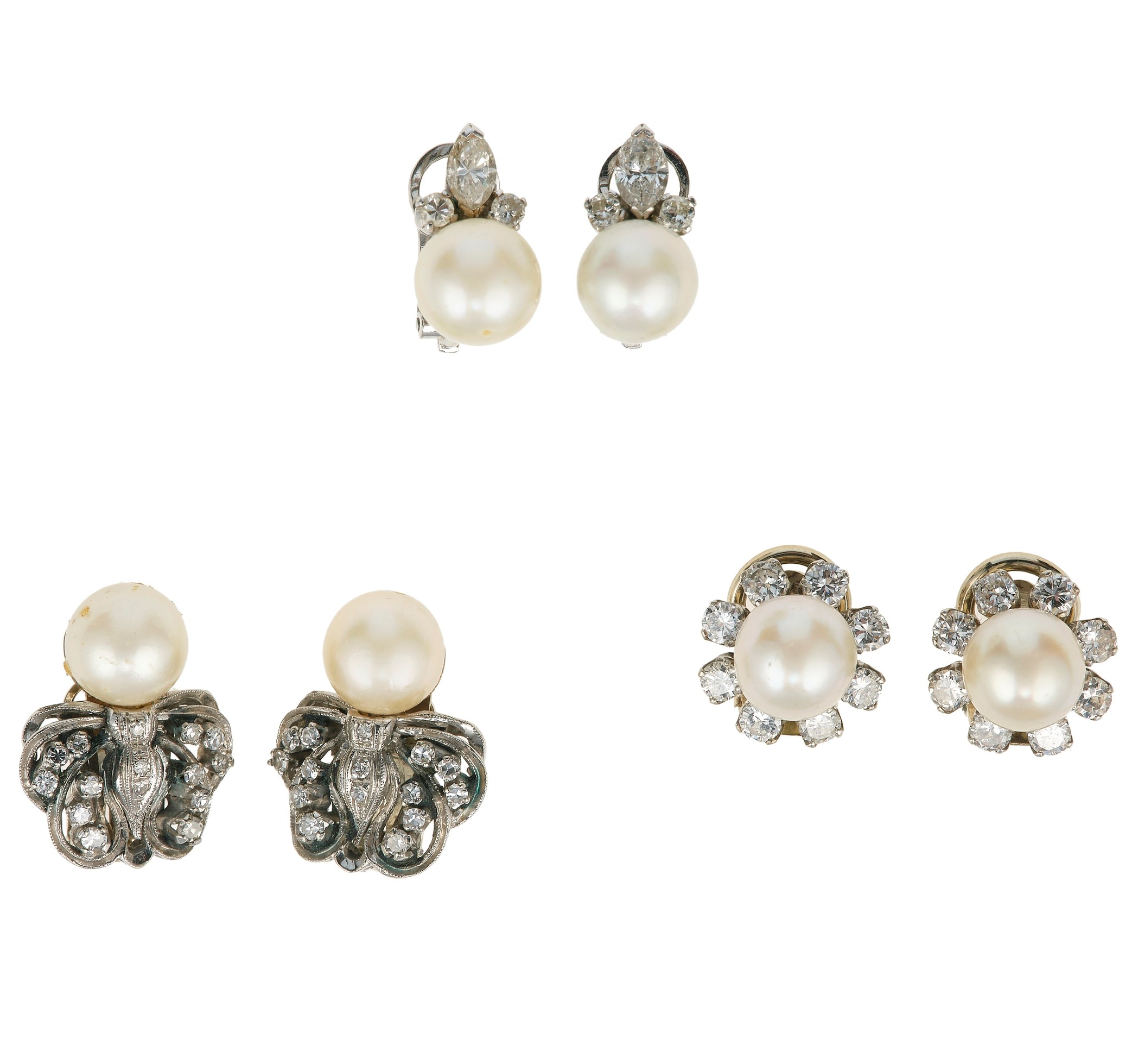 Three pair of cultured pearl and diamond earrings