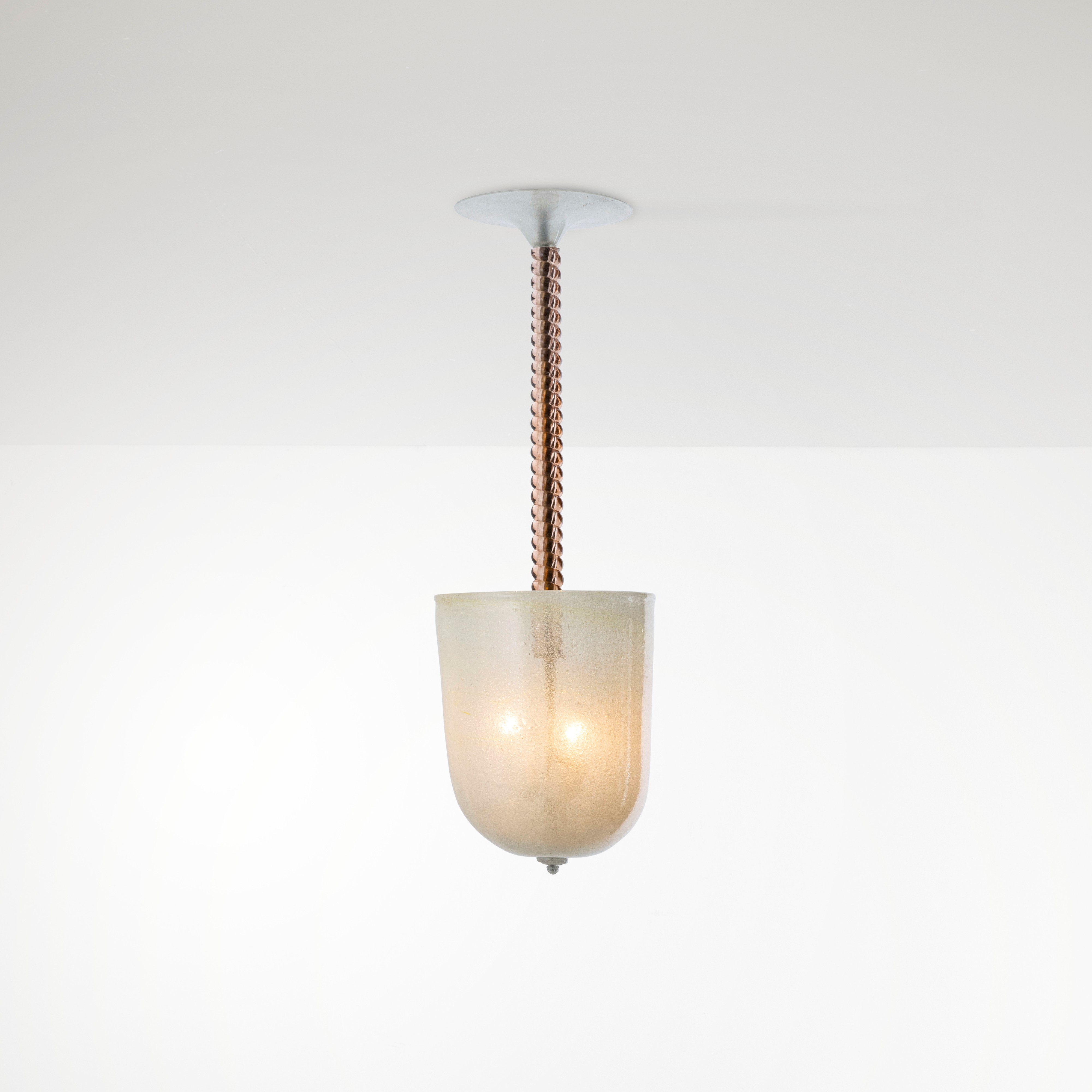 Struttura in metallo con fusto in vetro di Murano policromo a treccia. Coppa e coprifilo in vetro di Murano a bollicine.