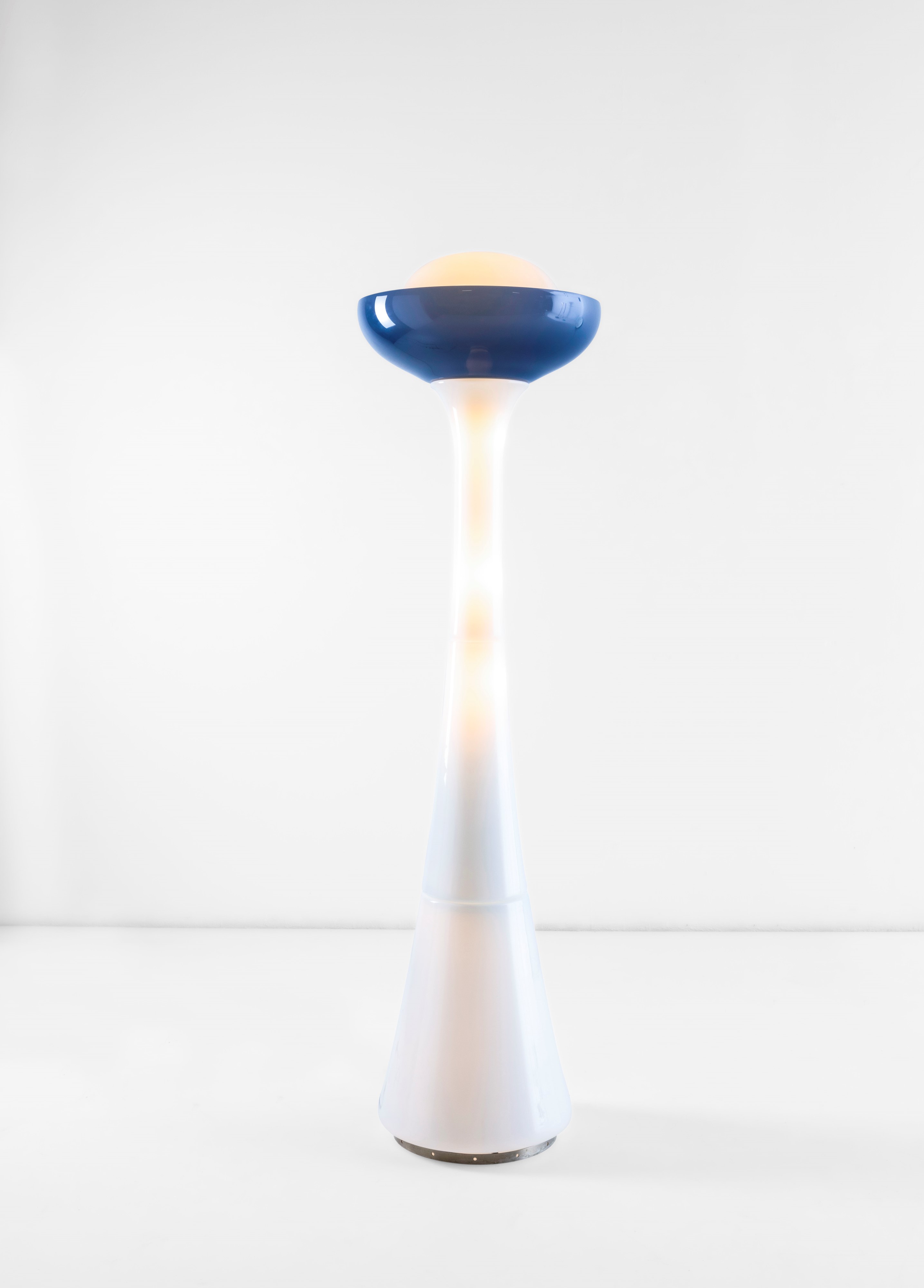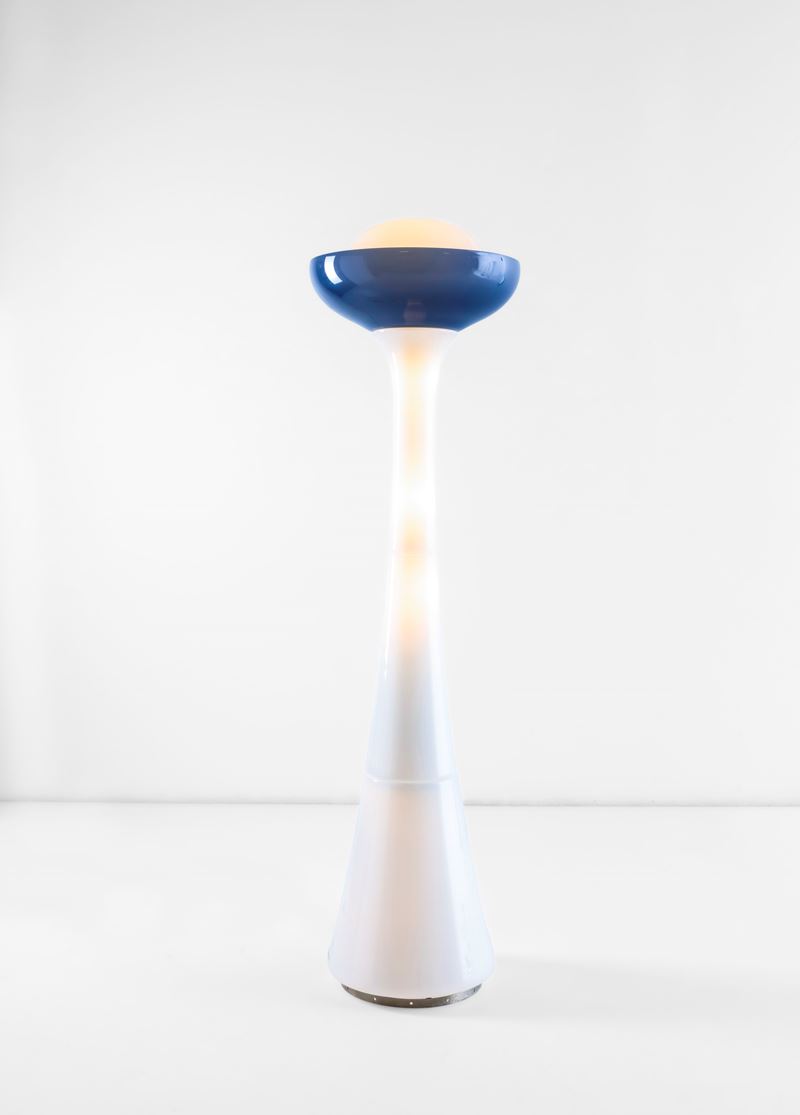 Struttura in metallo cromato e vetro lattimo di Murano e diffusore in vetro di Murano colorato.
