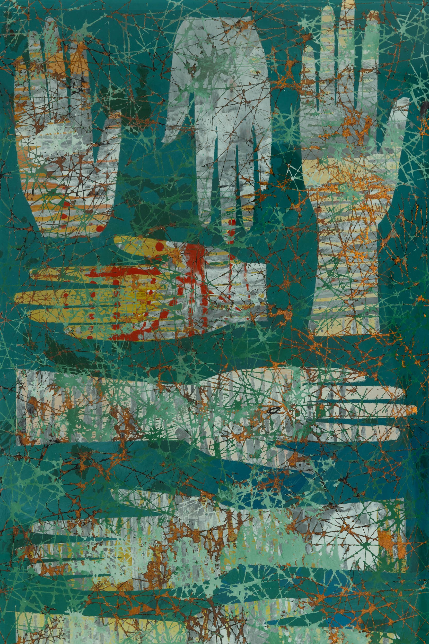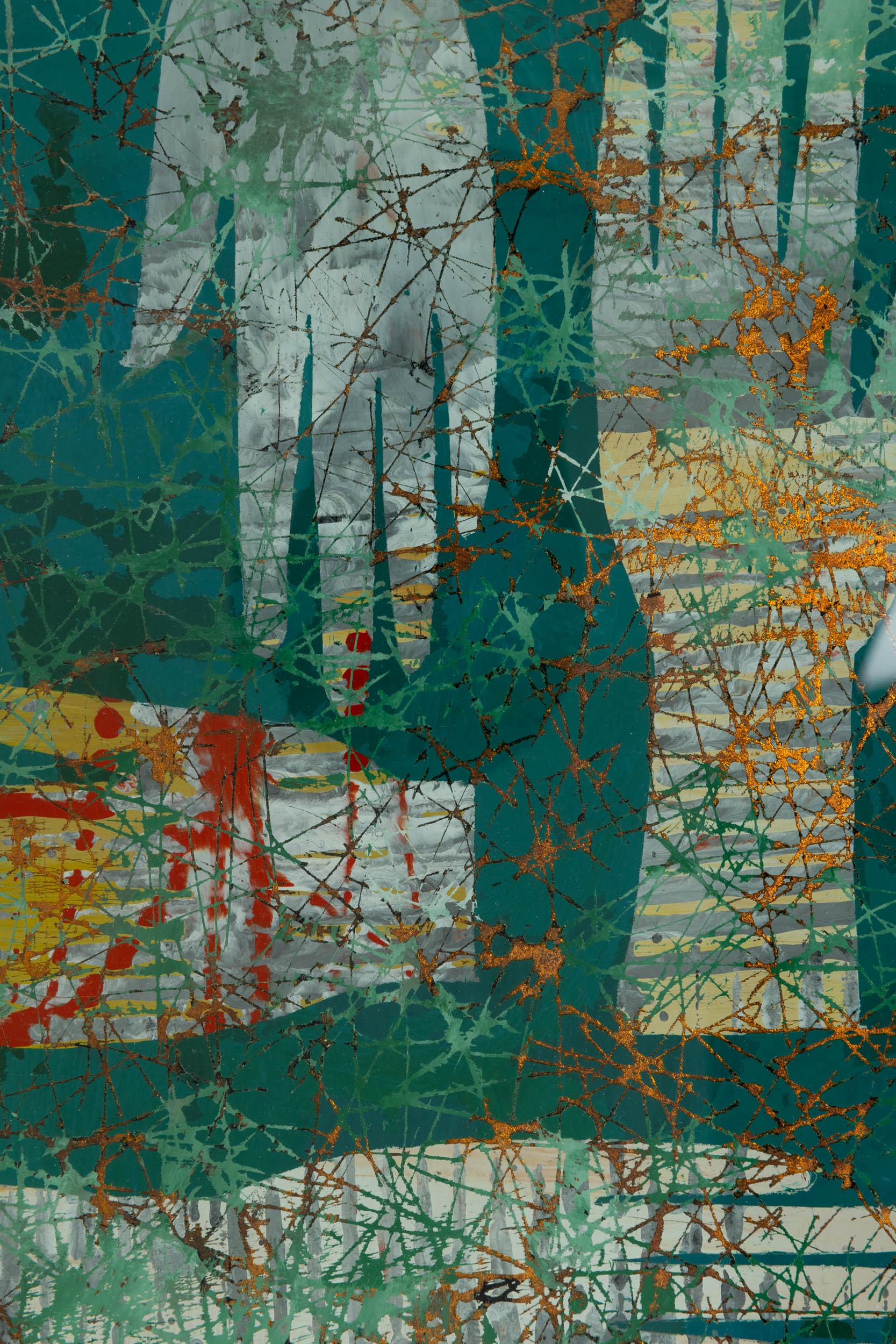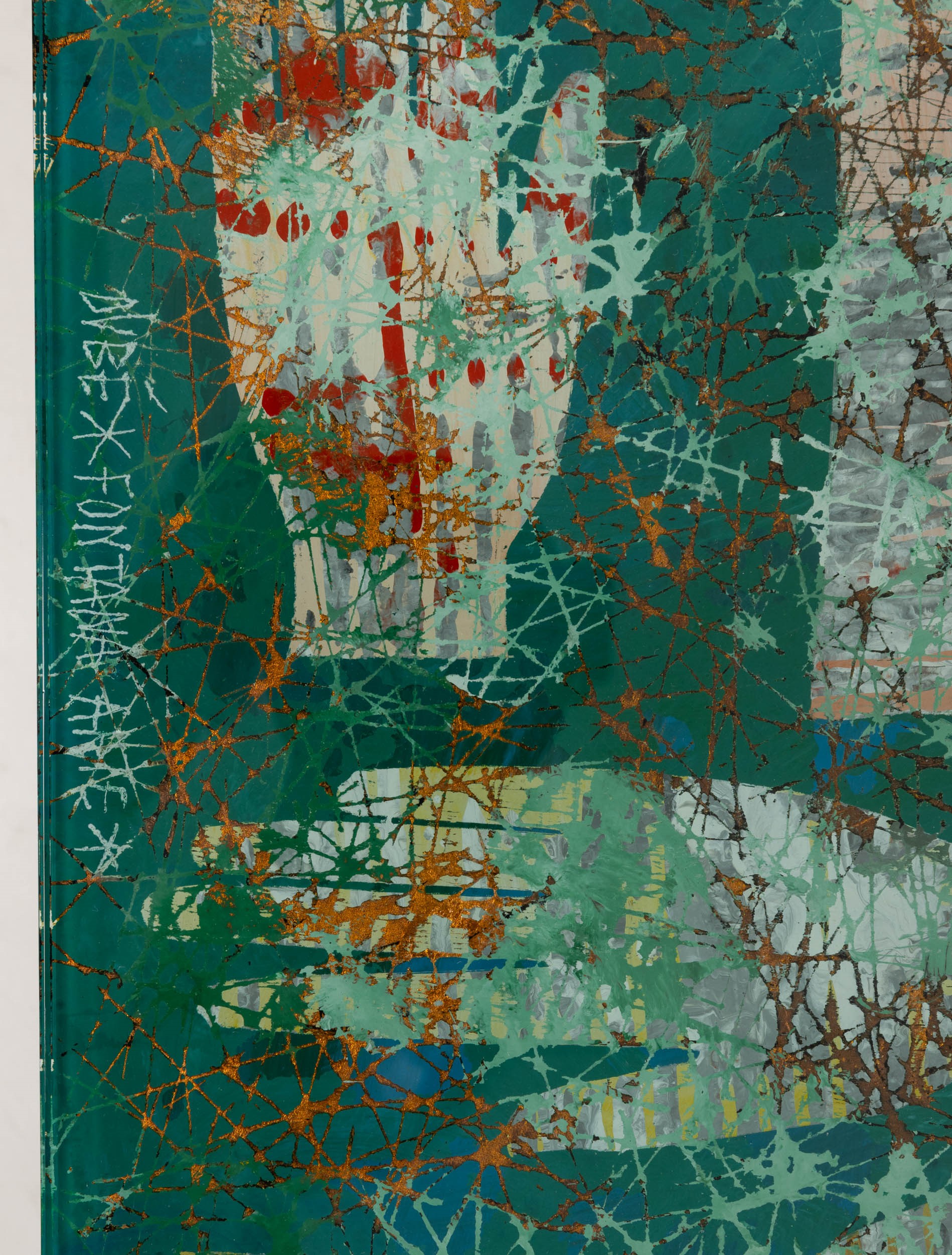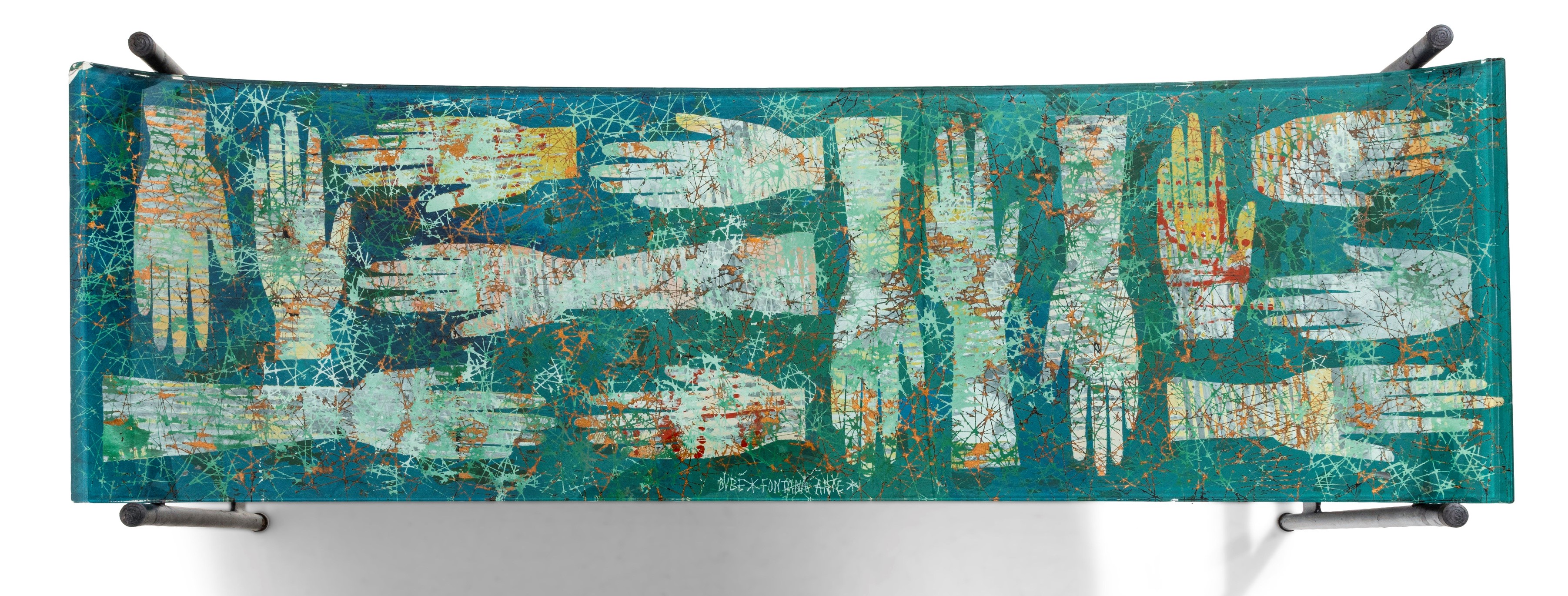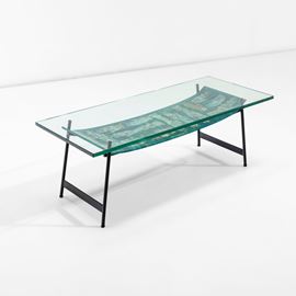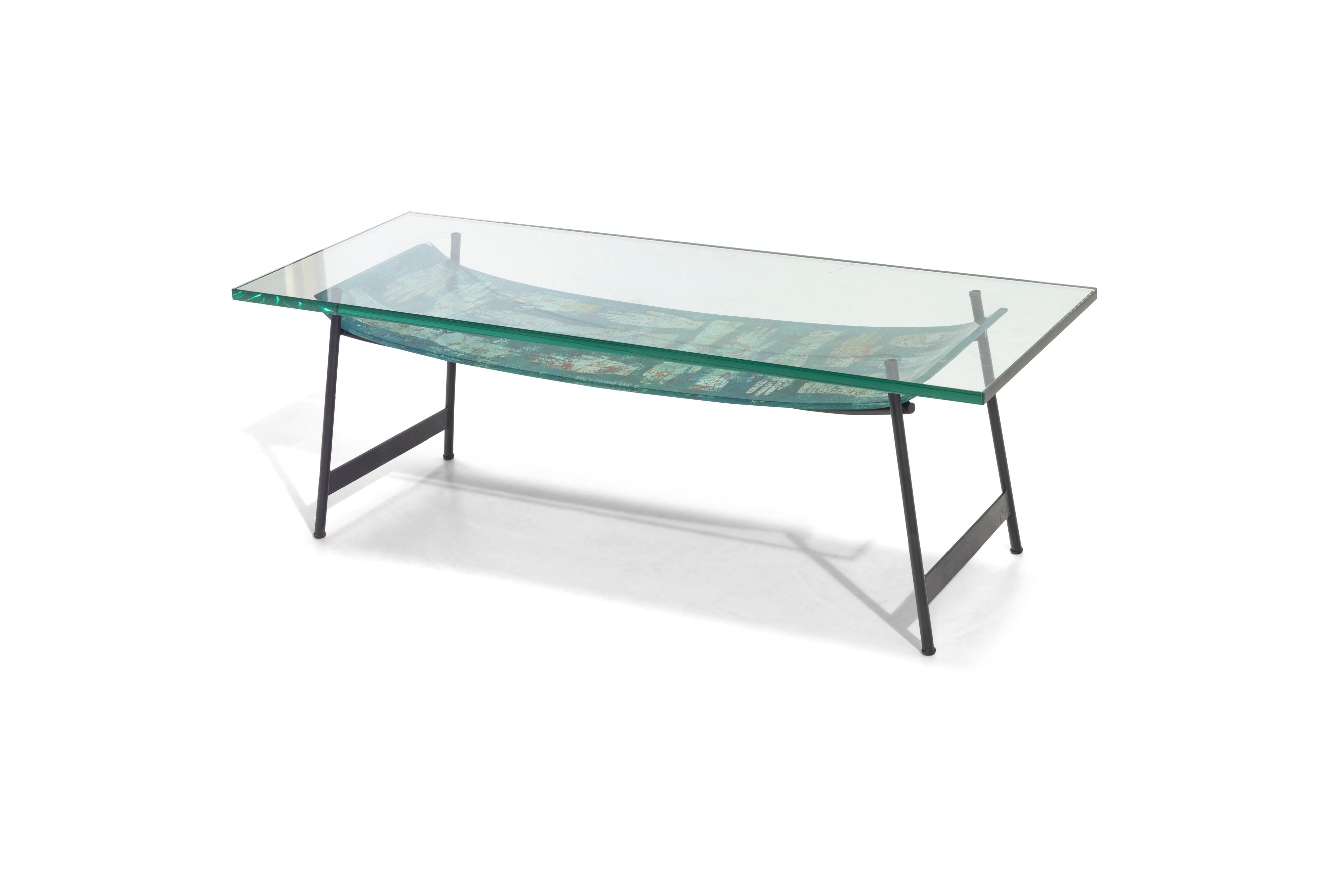 Piano in vetro colorato curvato con decoro eglomizzato.