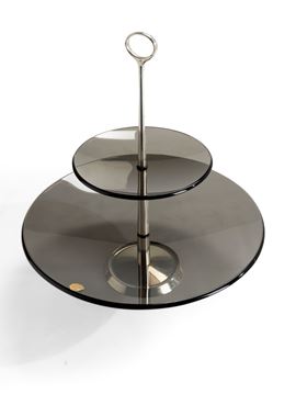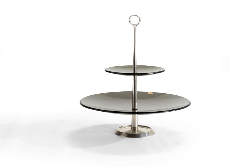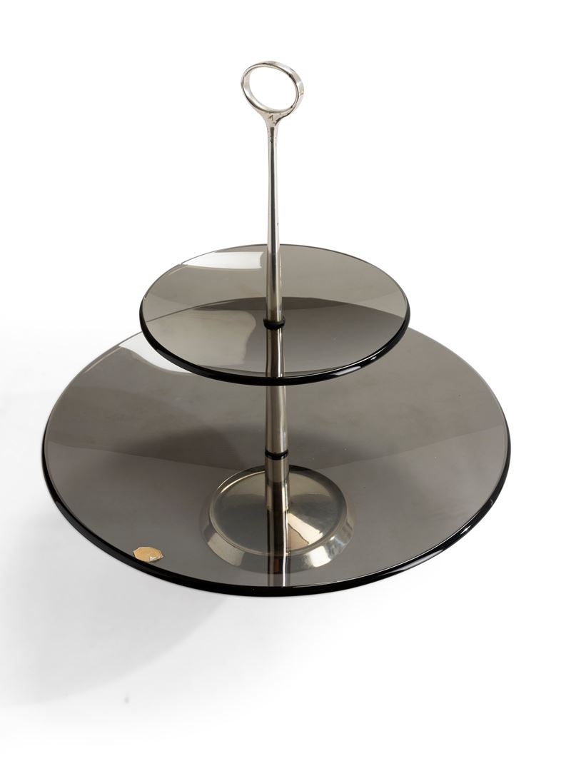 Struttura in ottone nichelato. Piani in cristallo colorato curvato e molato.
