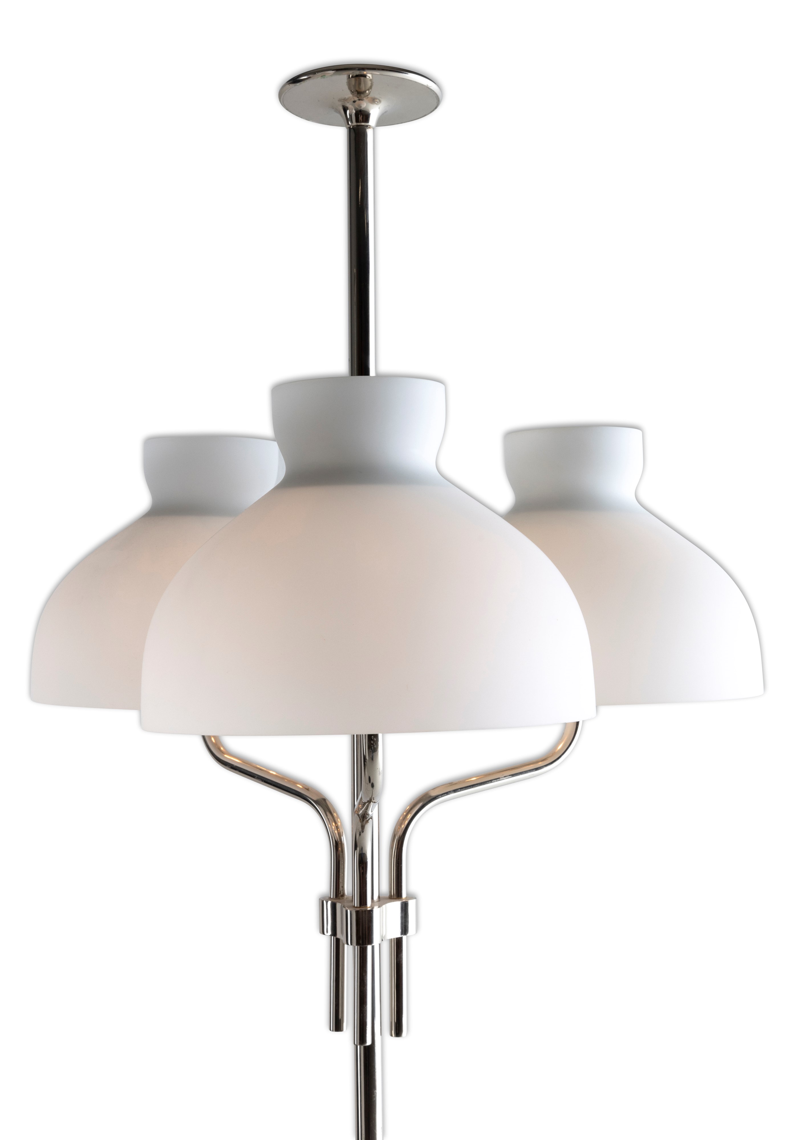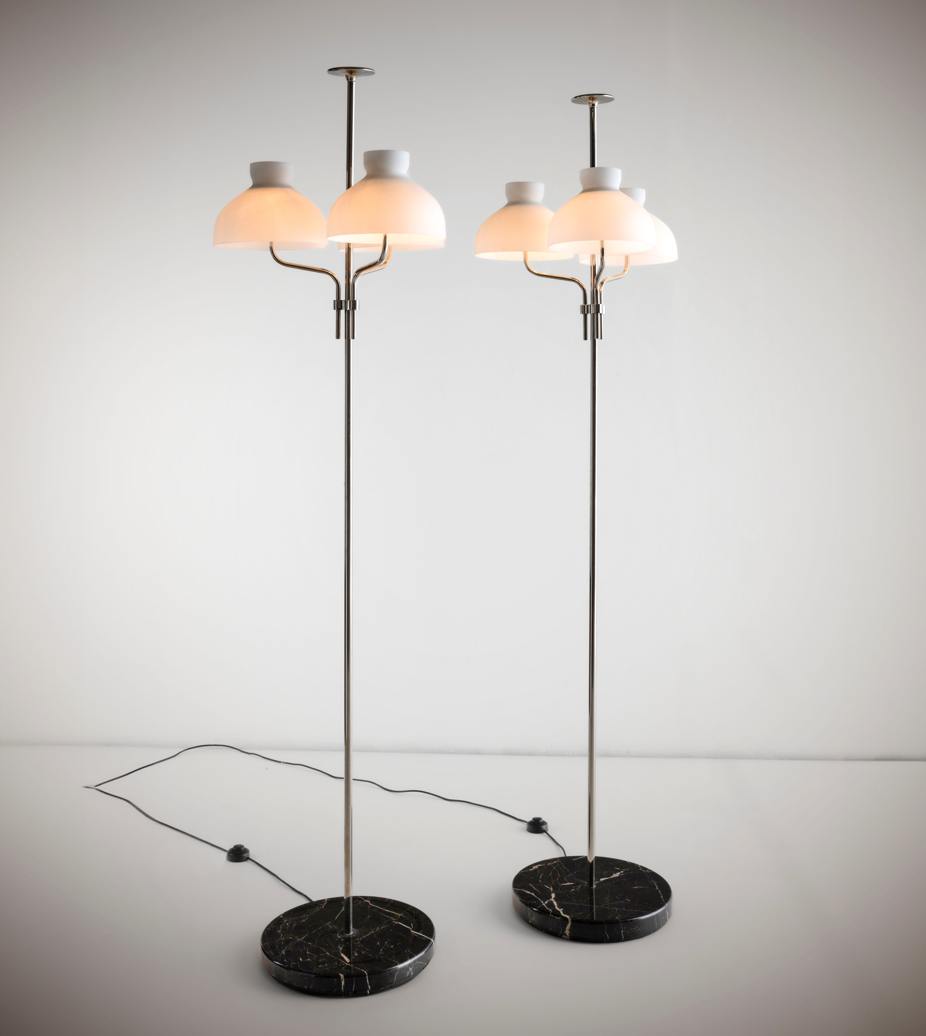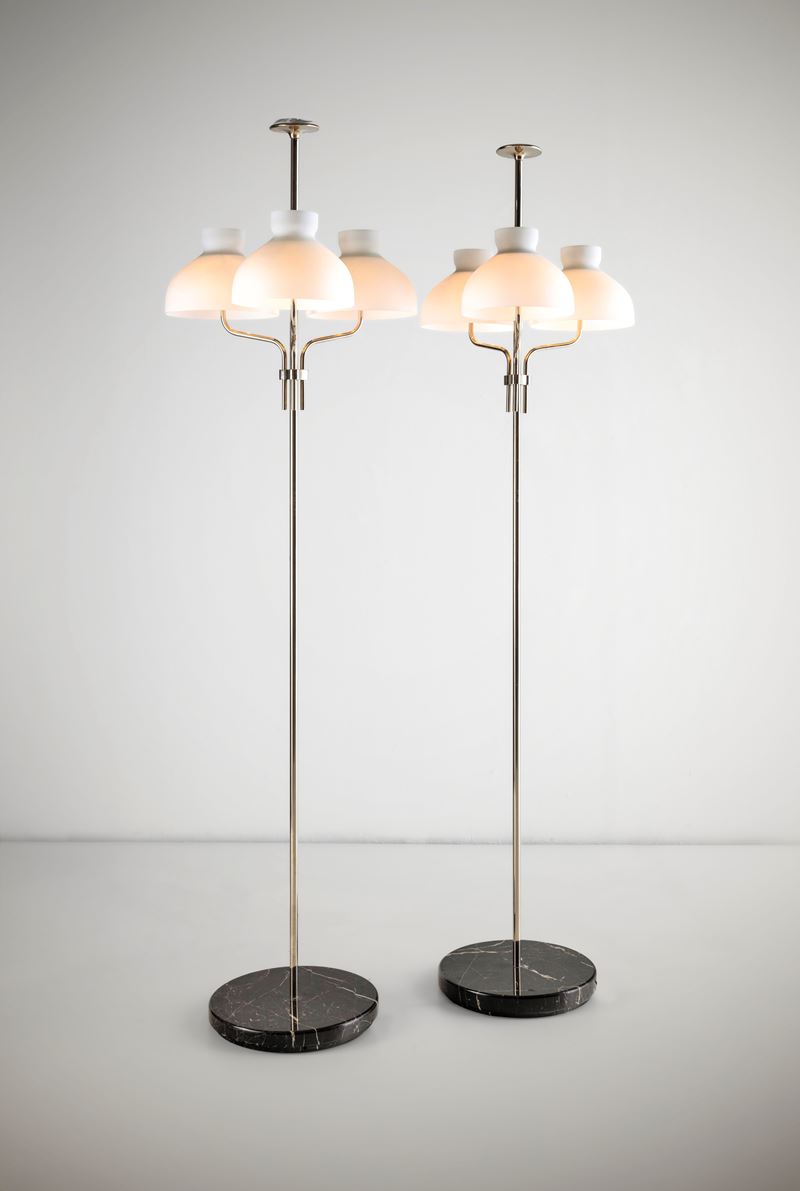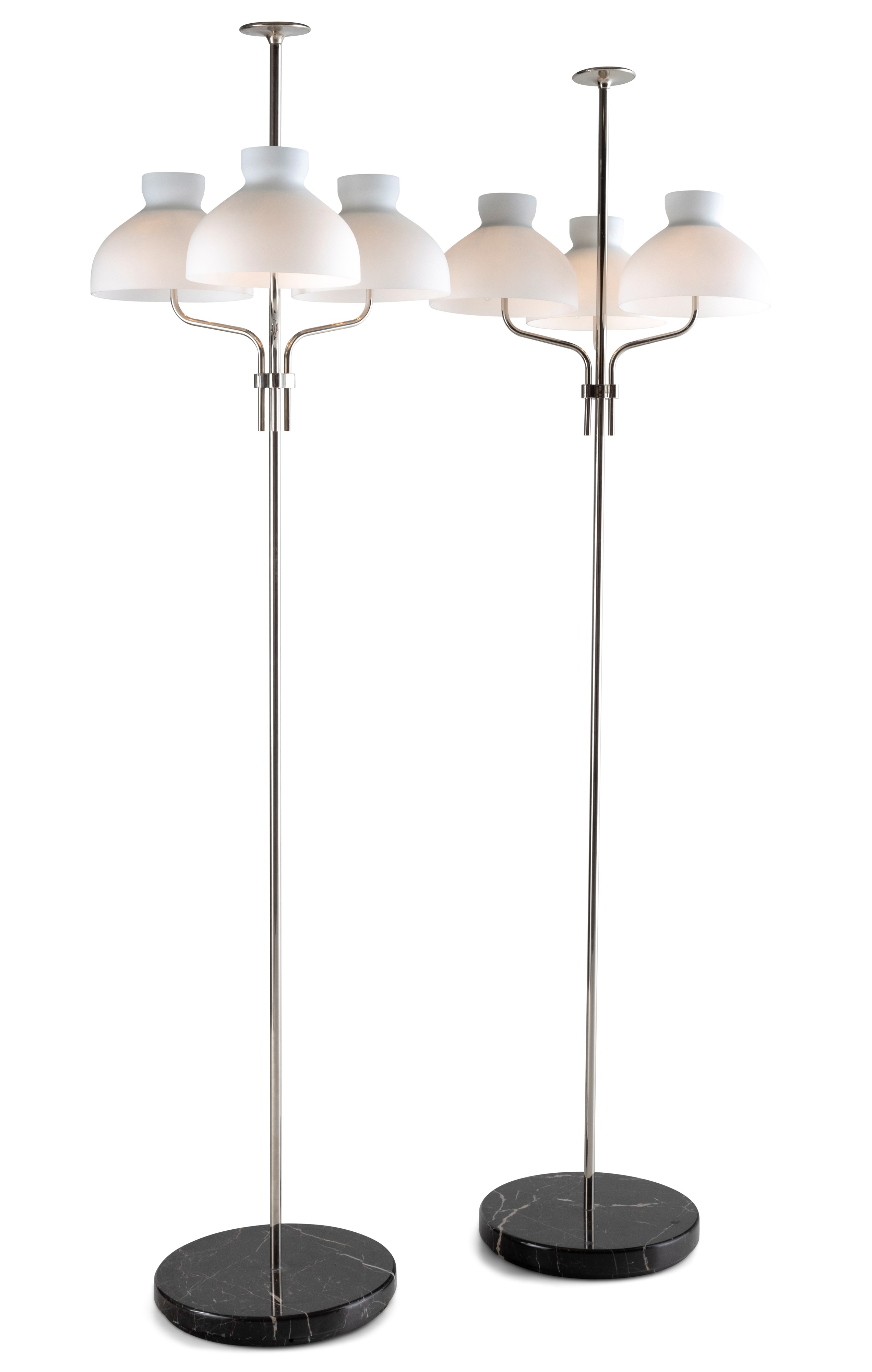 Struttura in metallo nichelato, diffusori in vetro opalino e base in marmo.