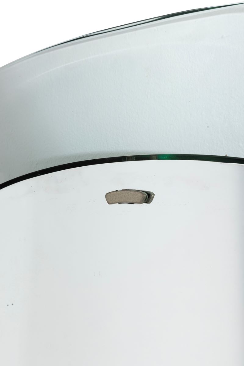 Struttura in metallo con vetro specchiato e cornice in cristallo curvato molato di forte spessore.