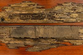 Elemento contenitore con opera in bronzo di Arnaldo Pomodoro. Particolari in ottone.