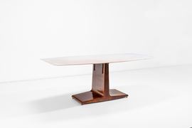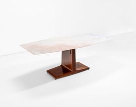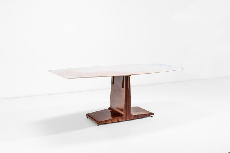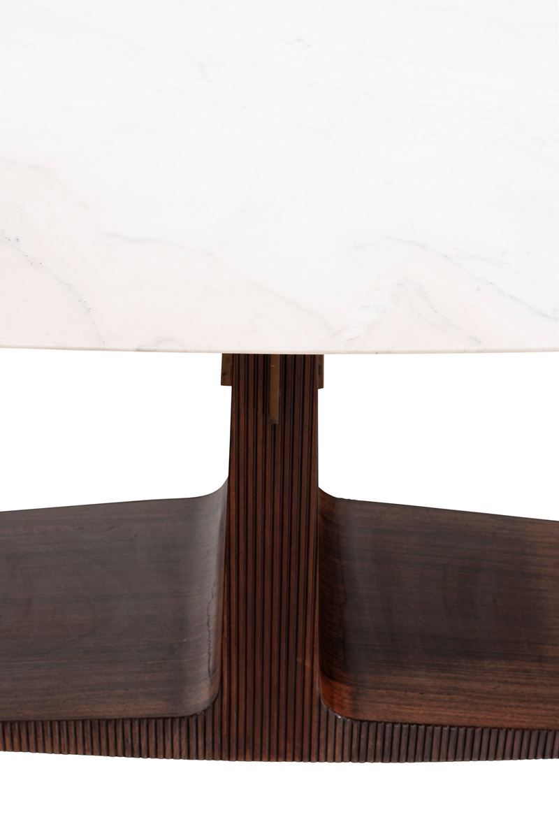 Struttura in legno, sostegno superiore in ottone e piano in marmo.