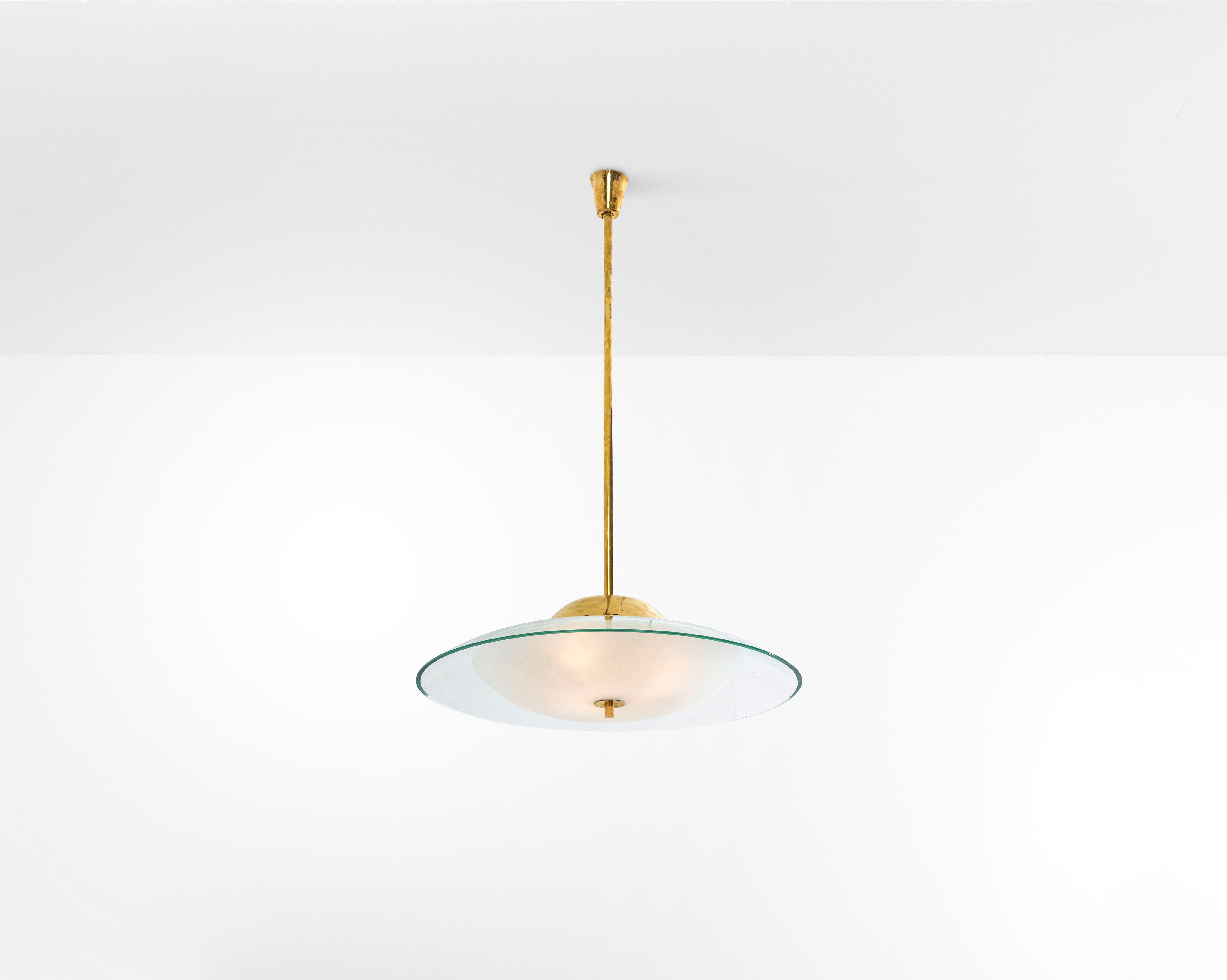 Struttura in ottone e diffusori in cristallo curvato molato e cristallo curvato satinato.