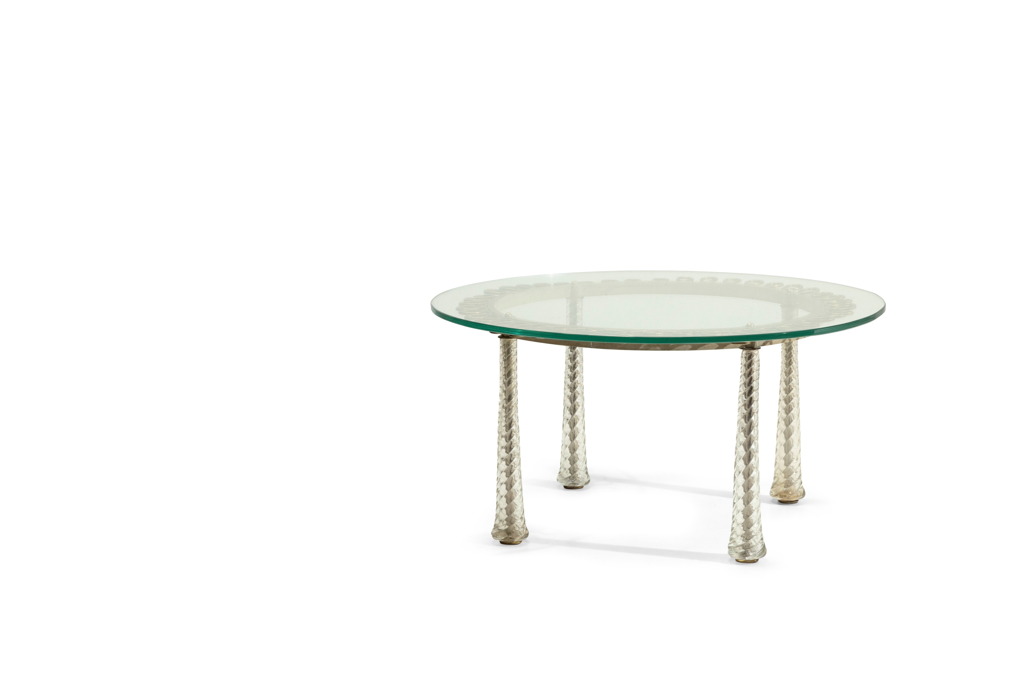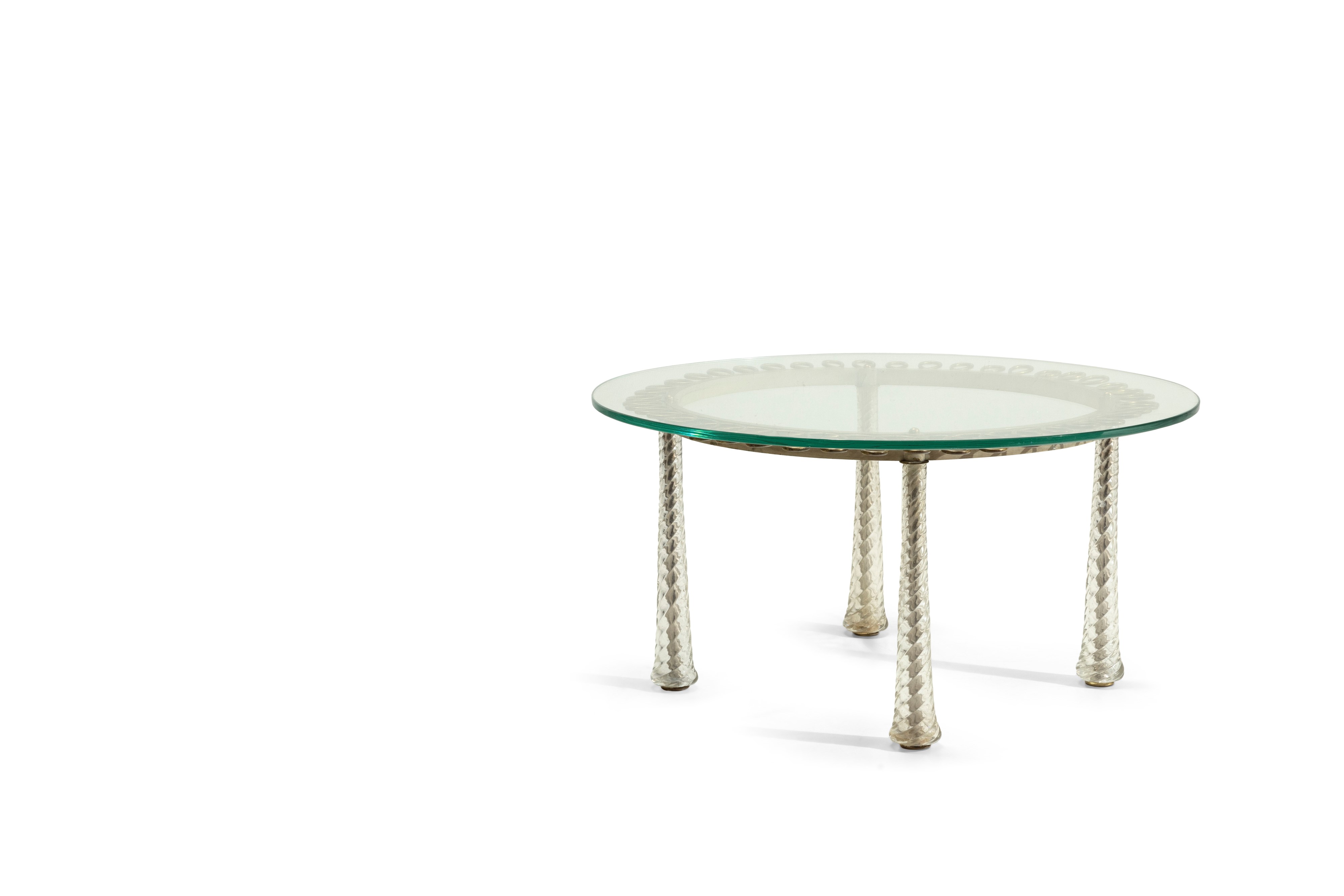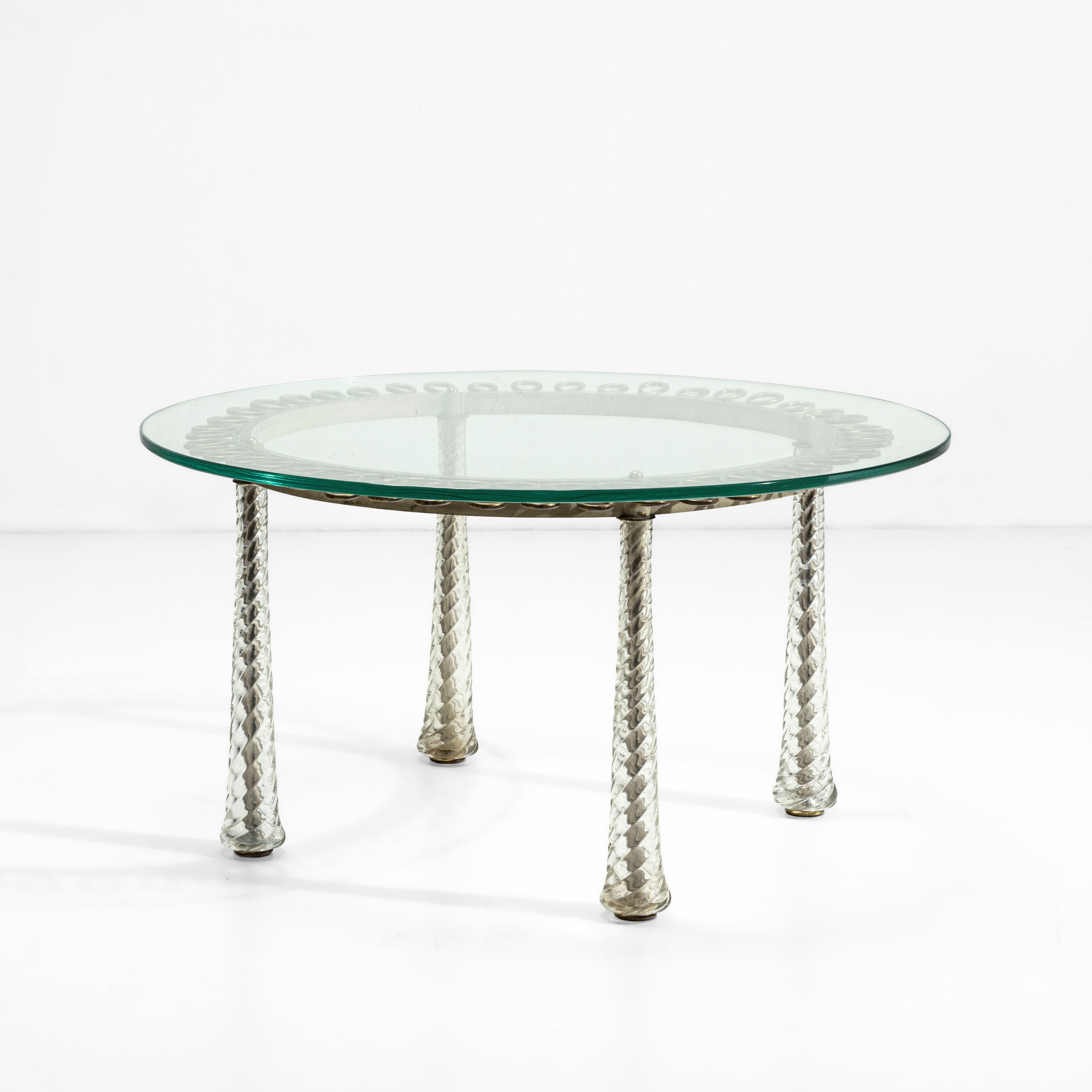 Struttura in ottone e metallo. Sostegni con rivestimenti in vetro di Murano a tortiglione. Piano in cristallo molato di forte spessore.