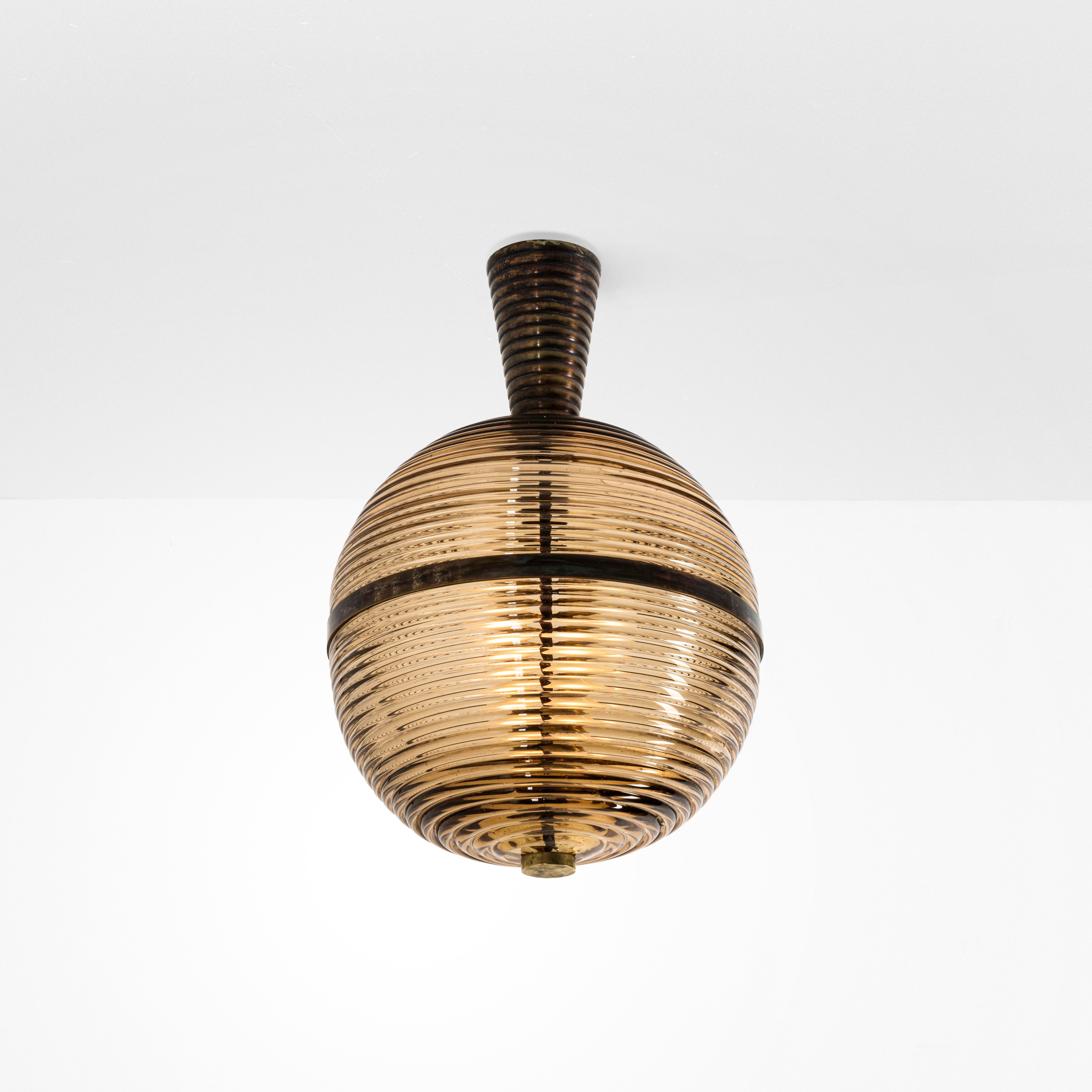Struttura in ottone e ottone lavorato con diffusori in vetro di Murano cordonato.