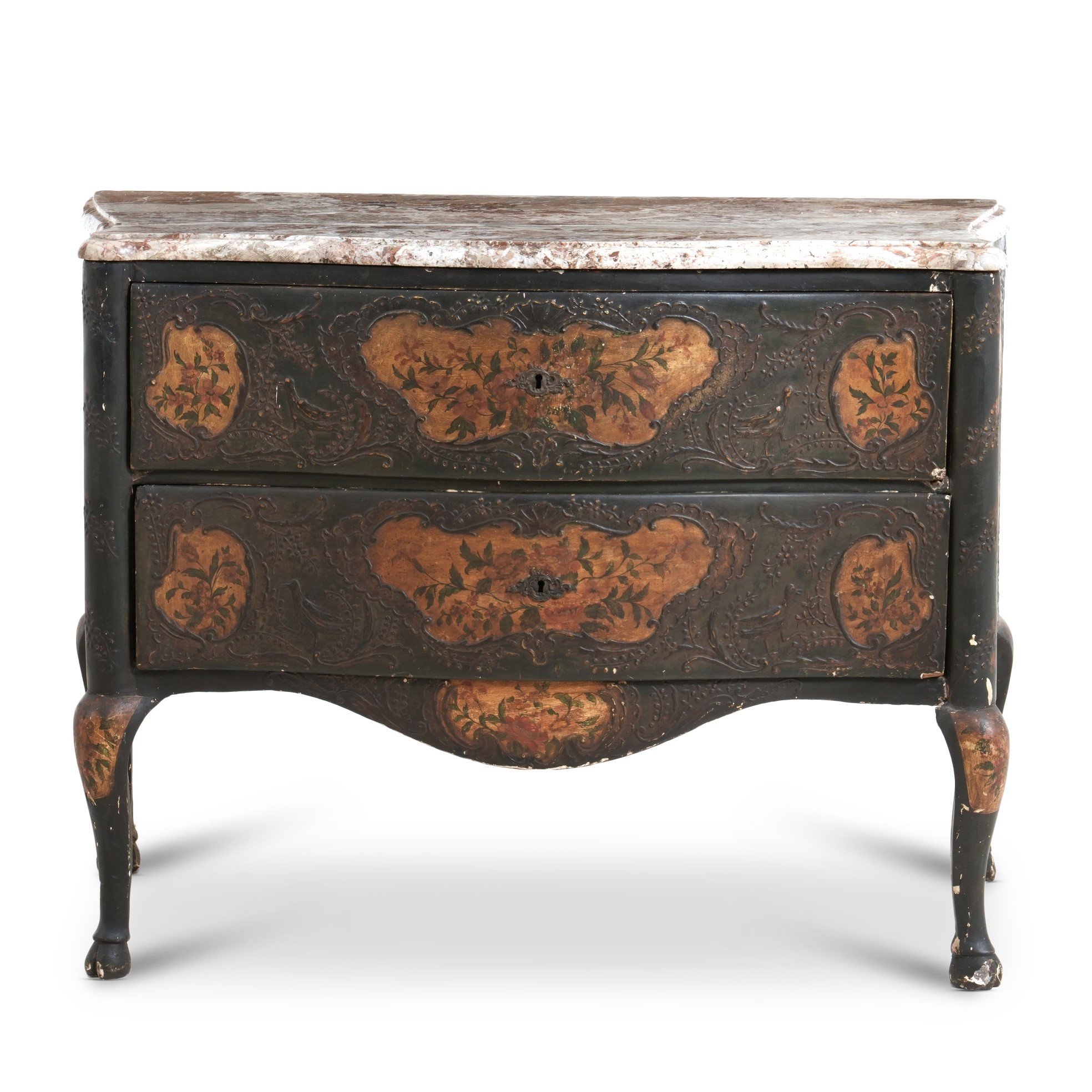 legno laccato, fronte mosso a due cassetti, pendaglina sagomata, gambe mosse su piedi a zoccolo. L'intera superficie è impreziosita da riserve sagomate con decoro a motivo di fiori e volatili. Piano sagomato in marmo
