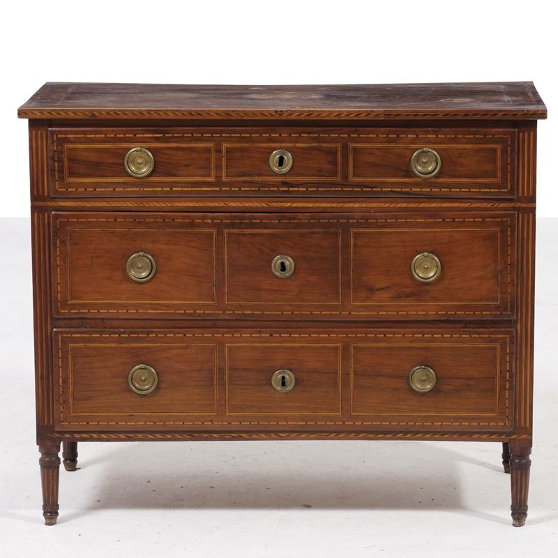 Comò Luigi XVI a tre cassetti in legno lastronato ed intarsiato. XVIII-XIX secolo