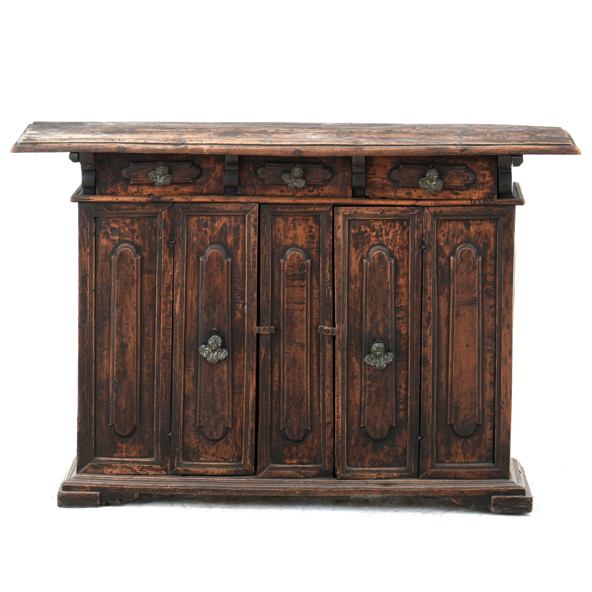 Fronte a due sportelli e tre cassettini, maniglie in bronzo a foggia di amorino