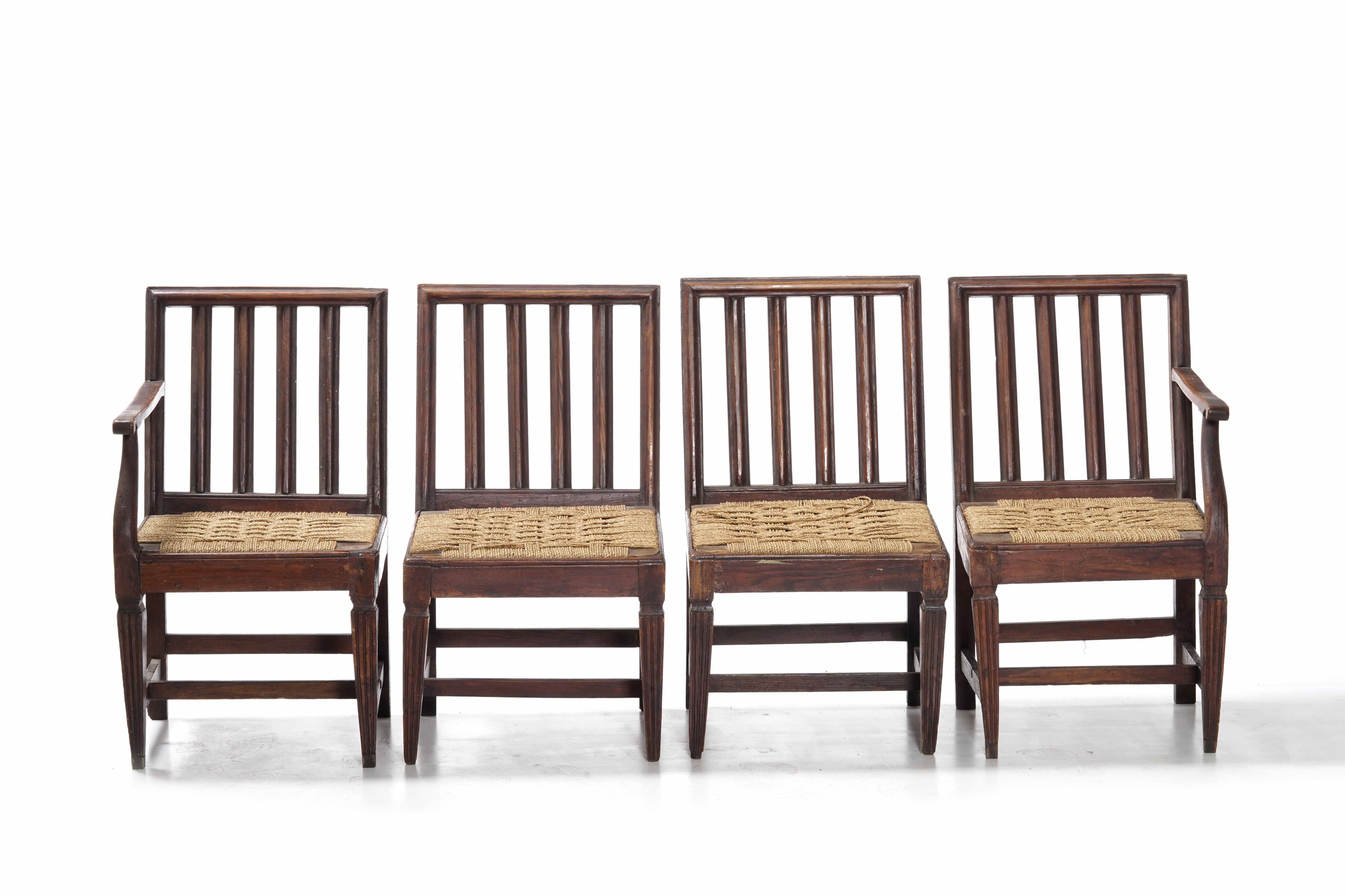 Seduta impagliata, schienale traforato, gambe rastremate; due con bracciolo singolo