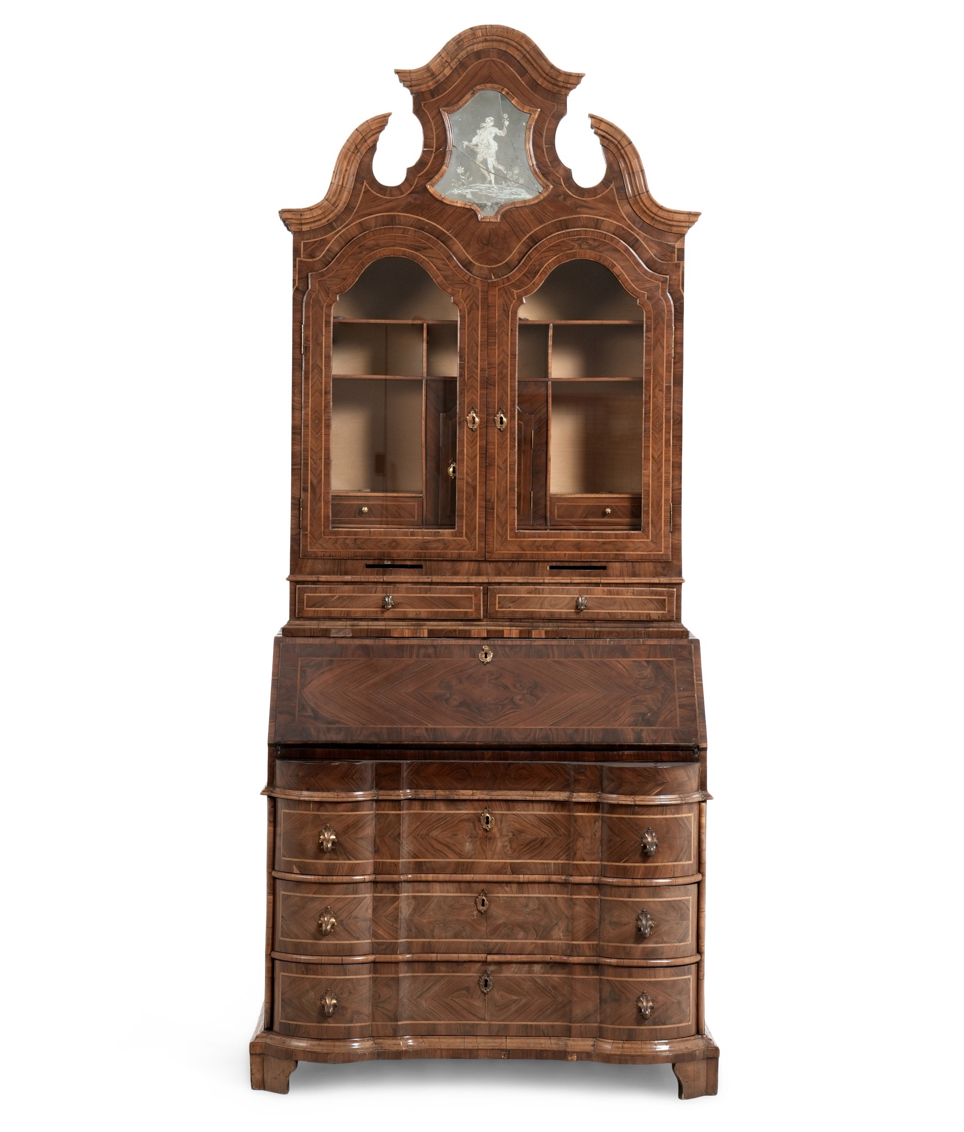 fronte mosso a tre cassetti alzata a due ante a vetro, cimasa a timpano spezzato centrata da vetro decorato con figura di giovane (difetti)