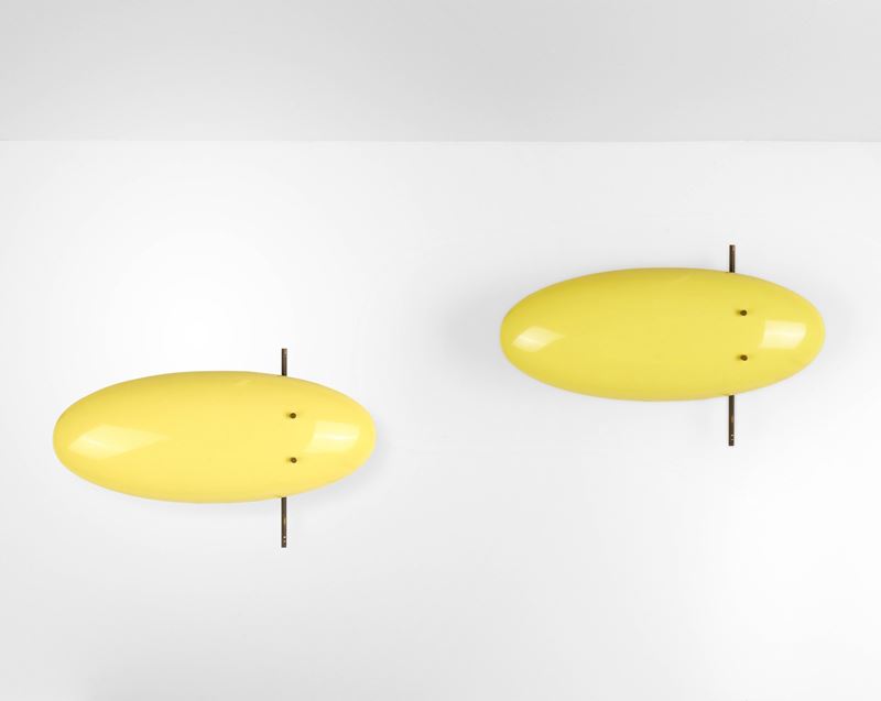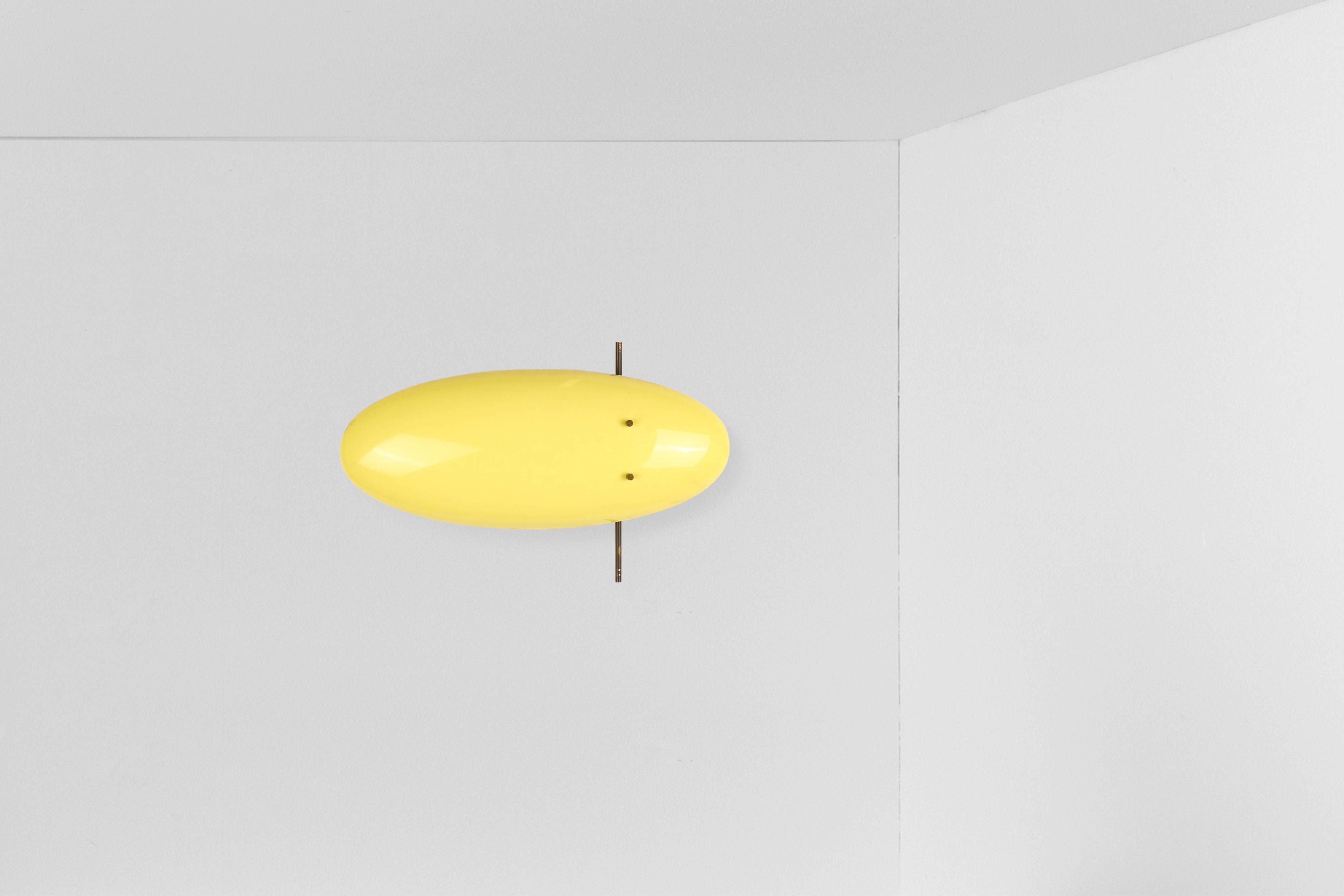 Struttura in metallo laccato e ottone. Diffusore in perspex colorato.