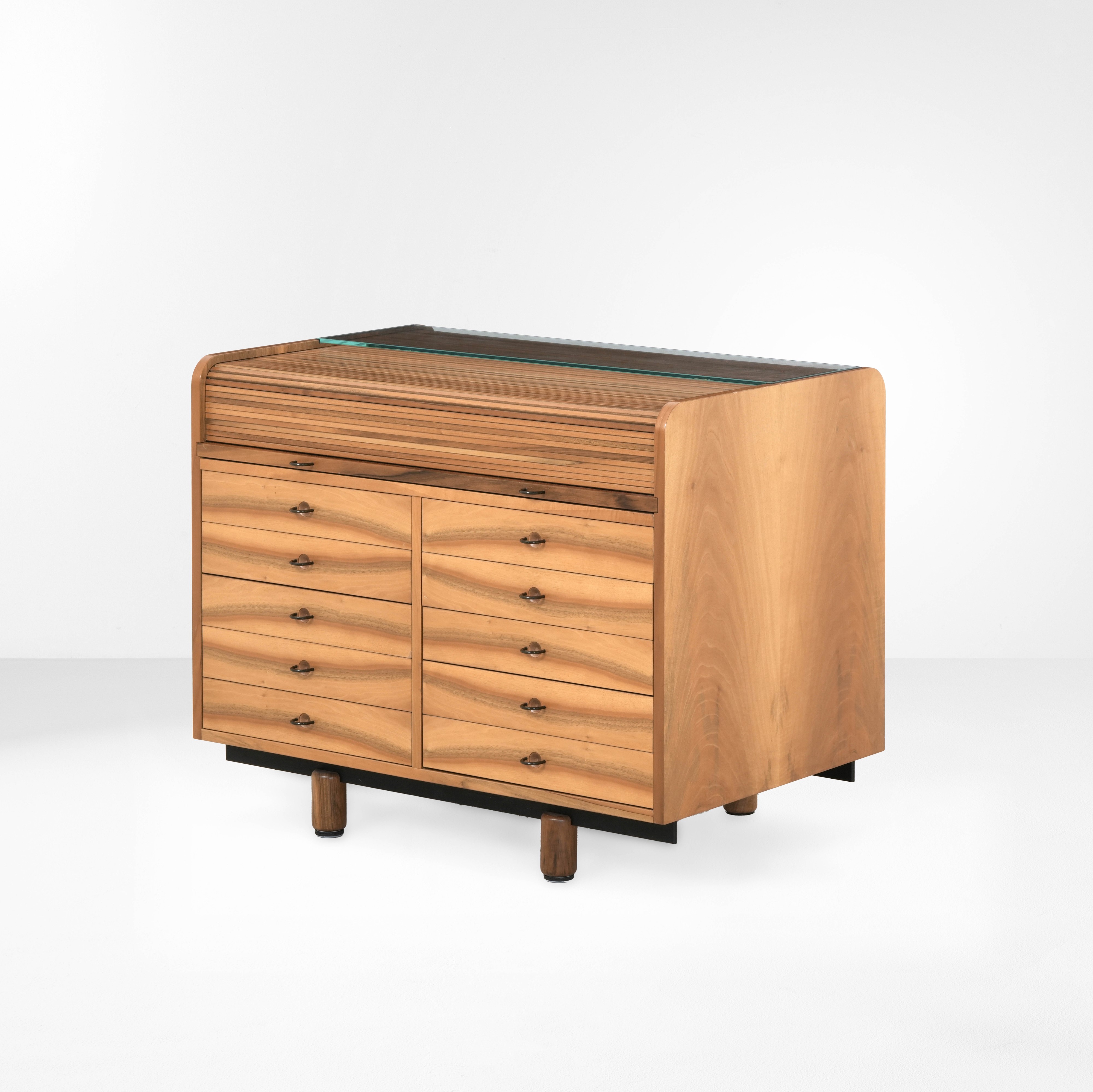 Struttura in legno, movimento a serrandina e dettagli in alluminio. Piano in vetro.