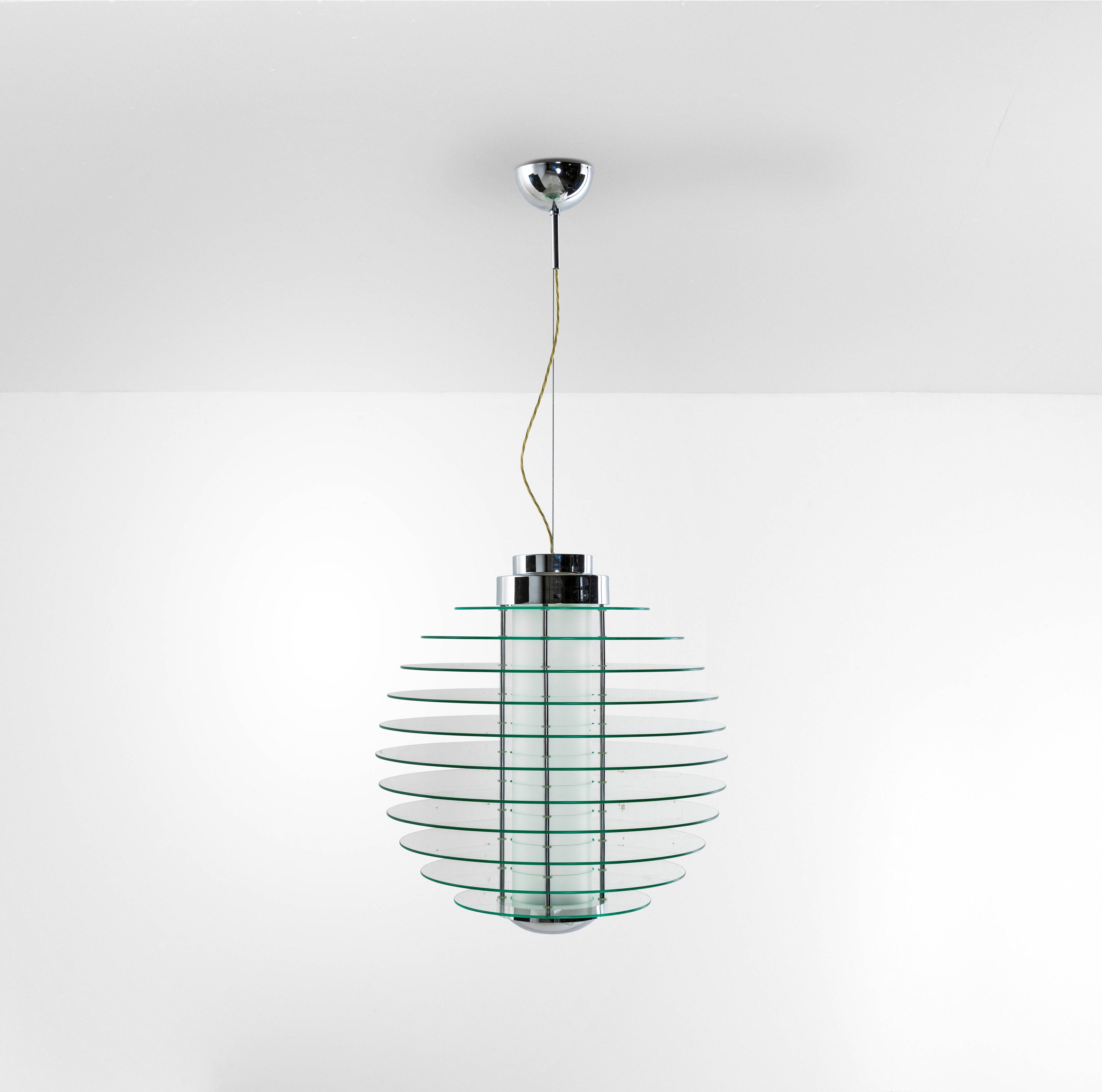 Struttura in acciaio e ottone cromato. Dischi in cristallo molato e diffusore centrale cilindrico in vetro sabbiato.