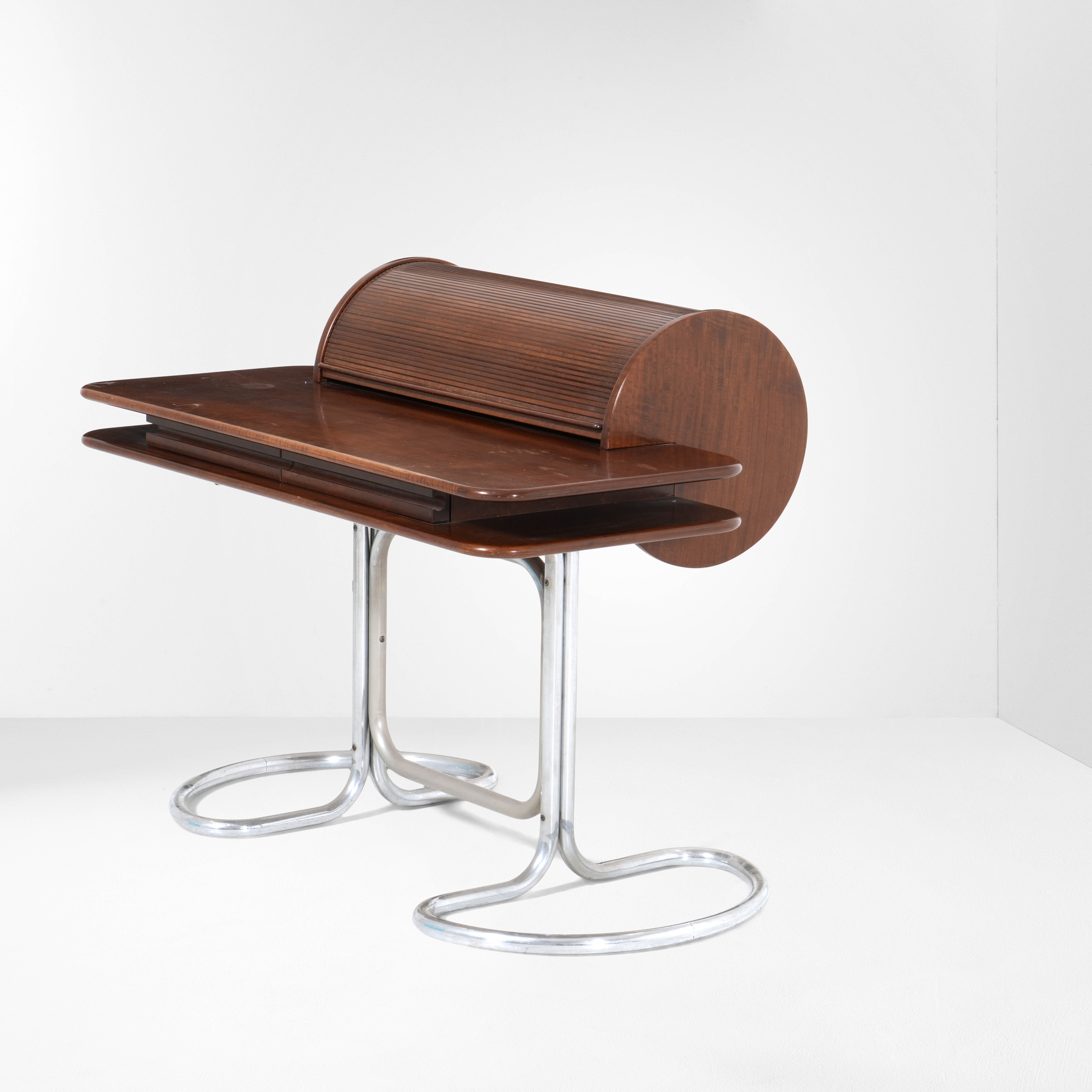 Struttura in tubolare di acciaio cromato e piano in legno. Elemento contenitore cilindrico in legno con chiusura a tapparella.