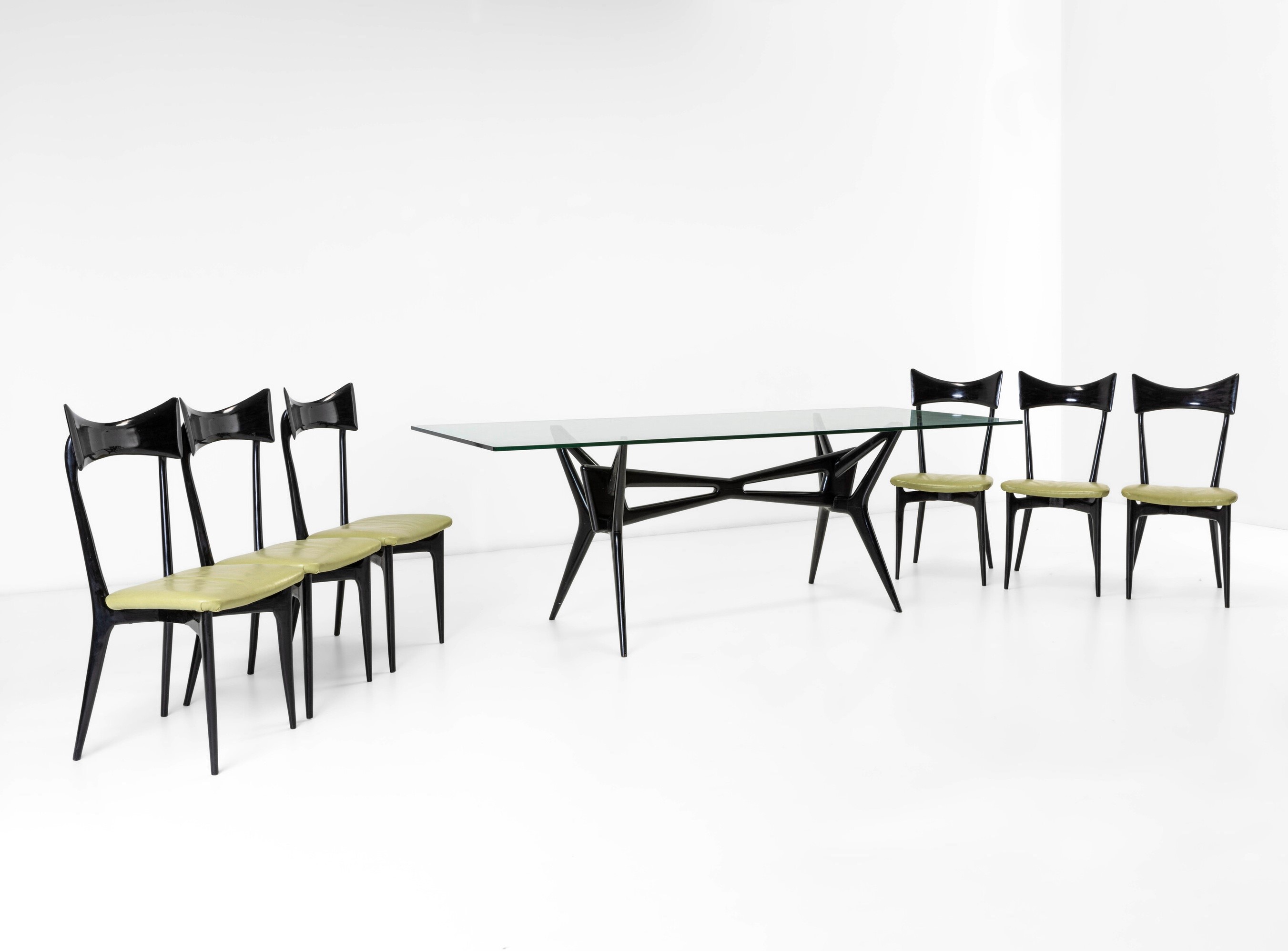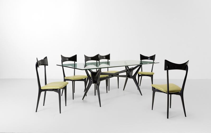 Struttura in legno ebanizzato, rivestimenti delle sedie in tessuto e piano del tavolo in vetro.