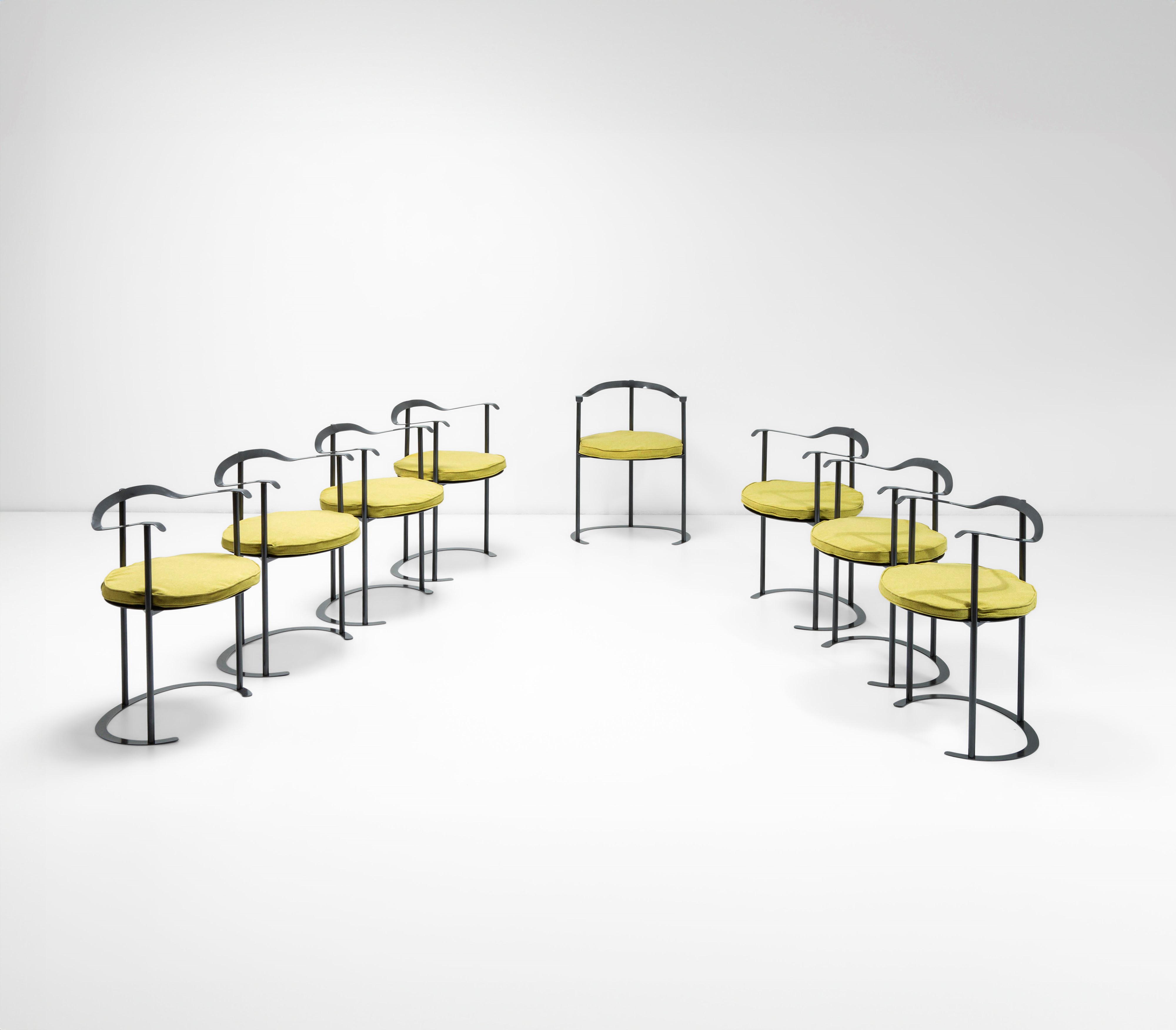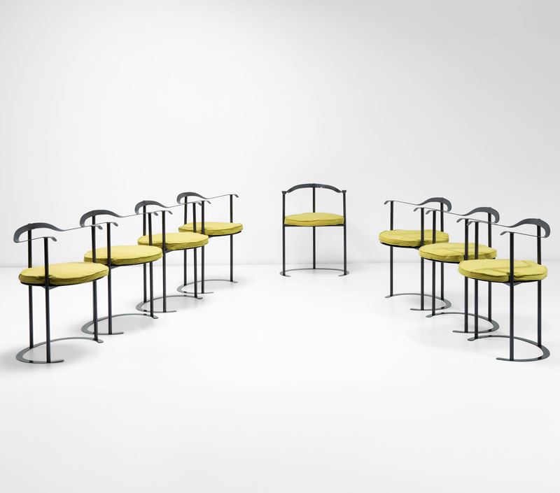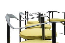 Struttura in metallo sagomato, forgiato e laccato. Seduta in metallo con cuscino amovibile in tessuto.