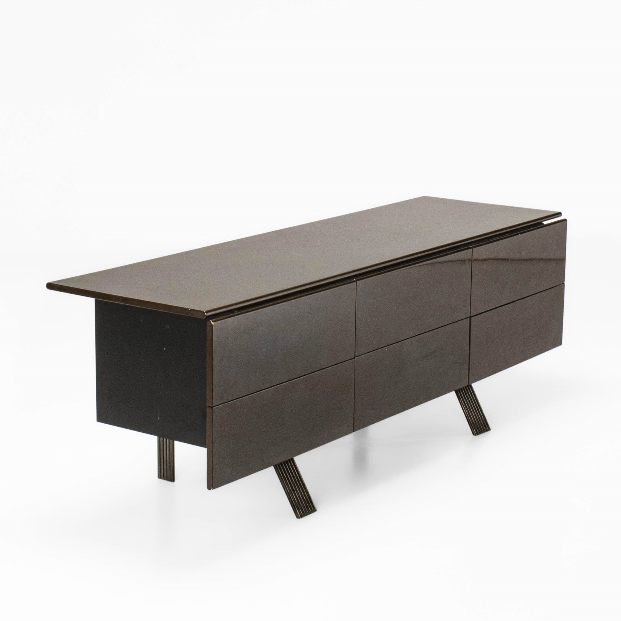 Struttura a sei cassetti in legno laccato e sostegni in metallo.