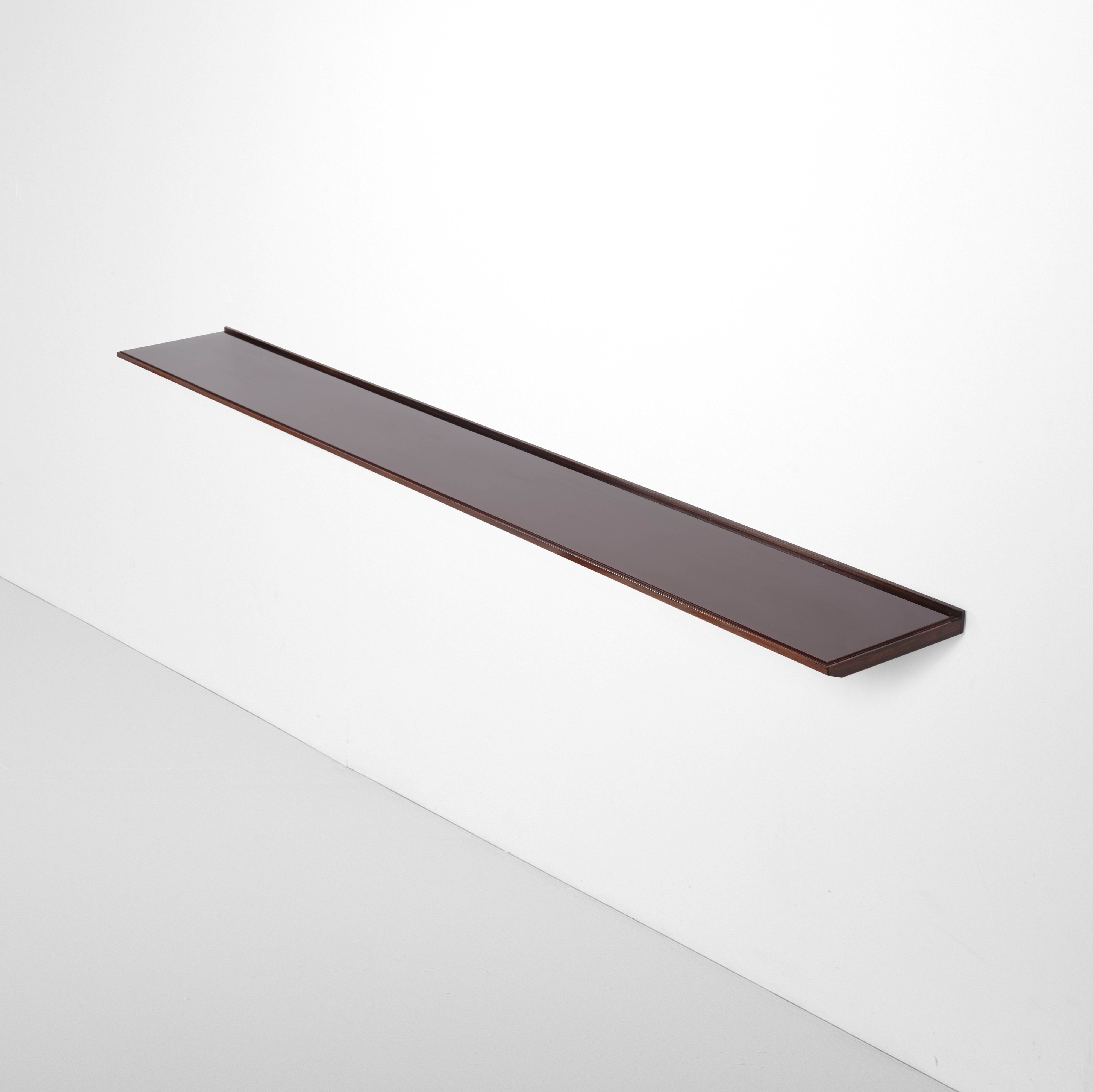 Grande consolle a parete in legno. Piano a parziale incasso costituito da una lastra in cristallo retrodipinto. Sostegni a parete in ottone.