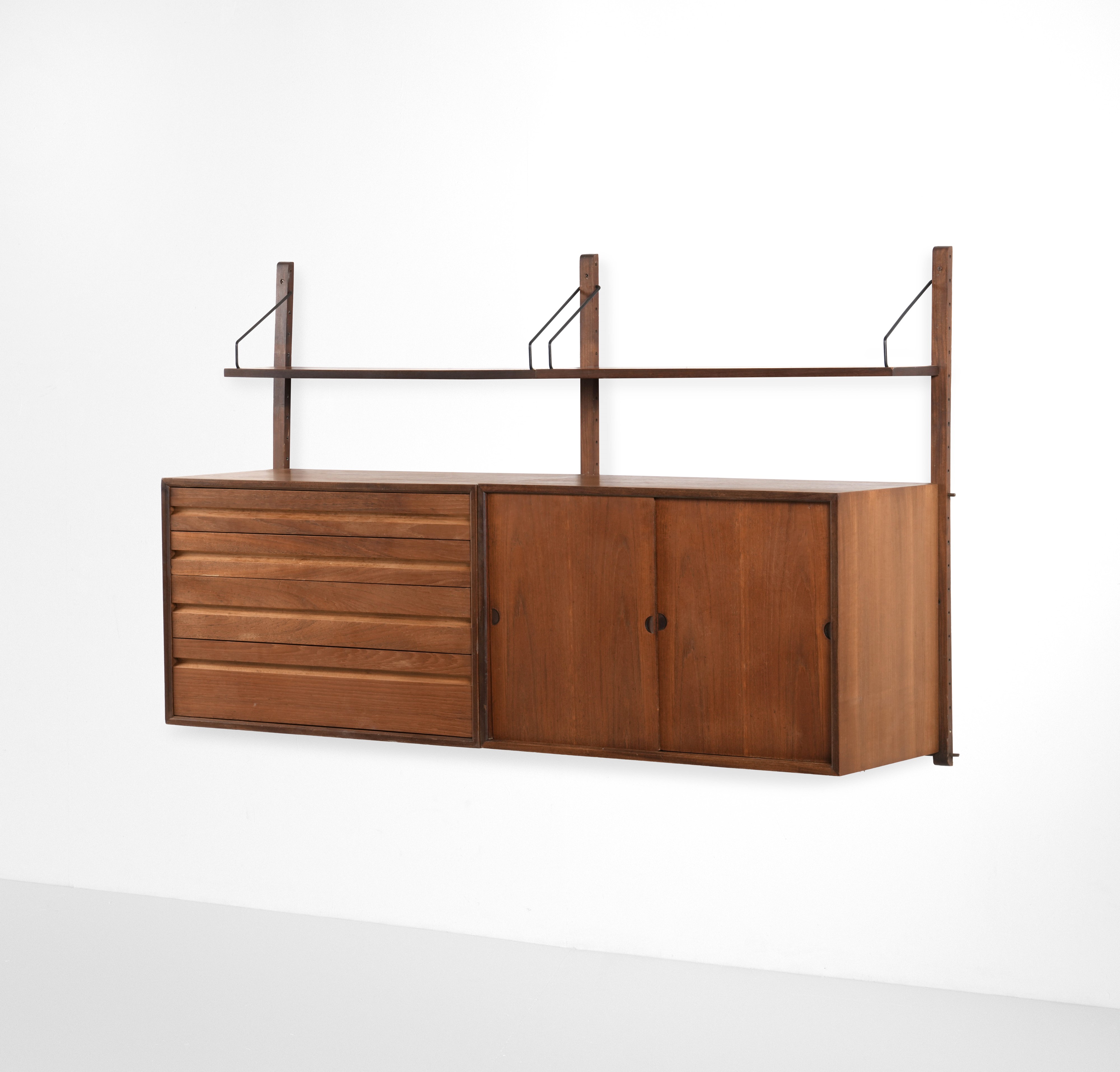 Mobili contenitori in legno con cassetti e ante a scorrimento.