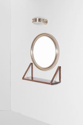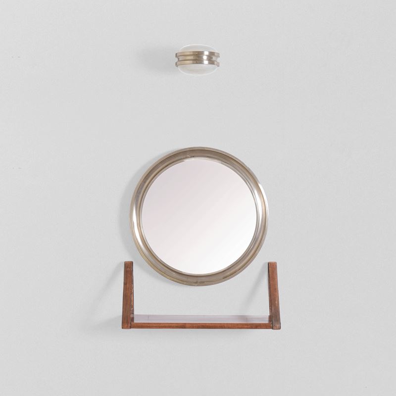 Struttura in metallo spazzolato. Diffusori in vetro satinato. Mensola in legno.