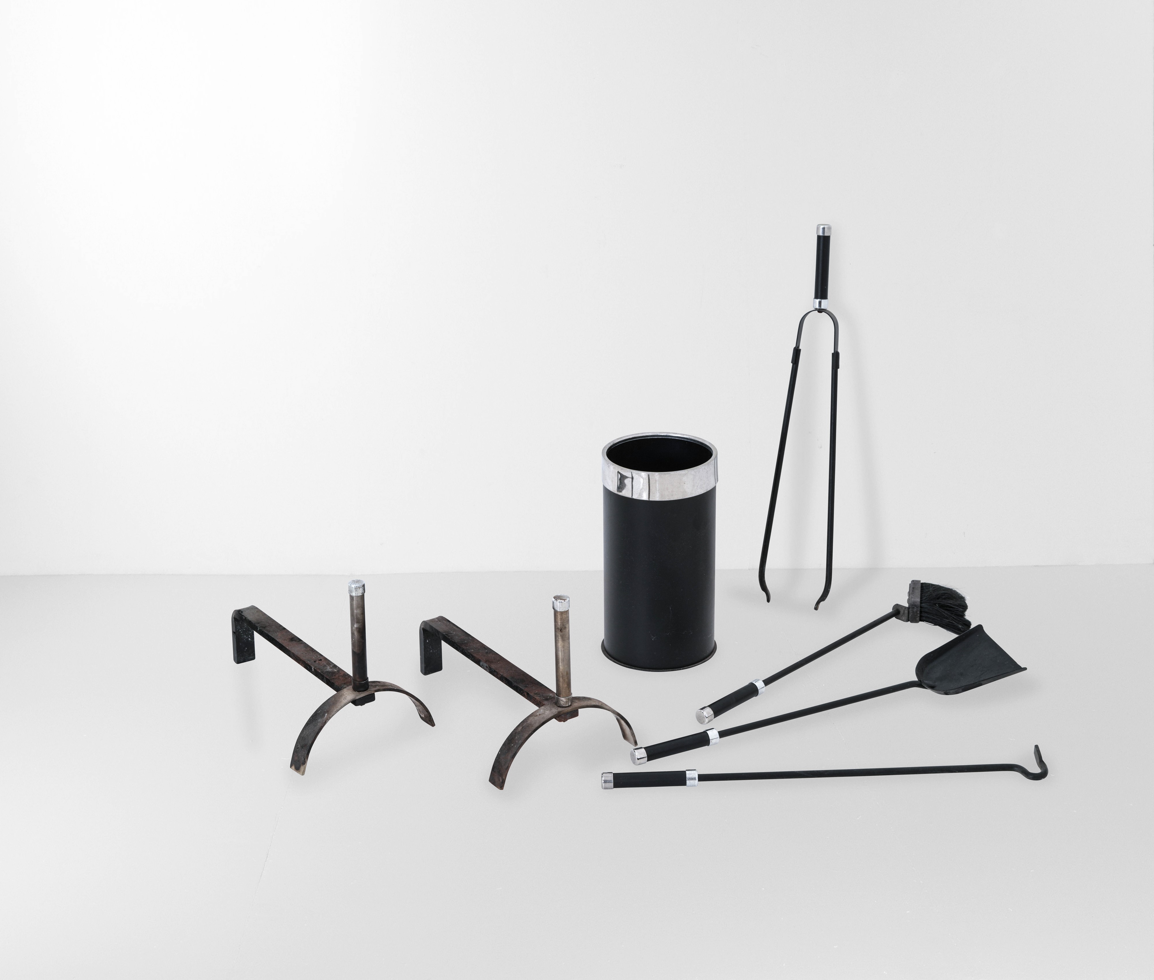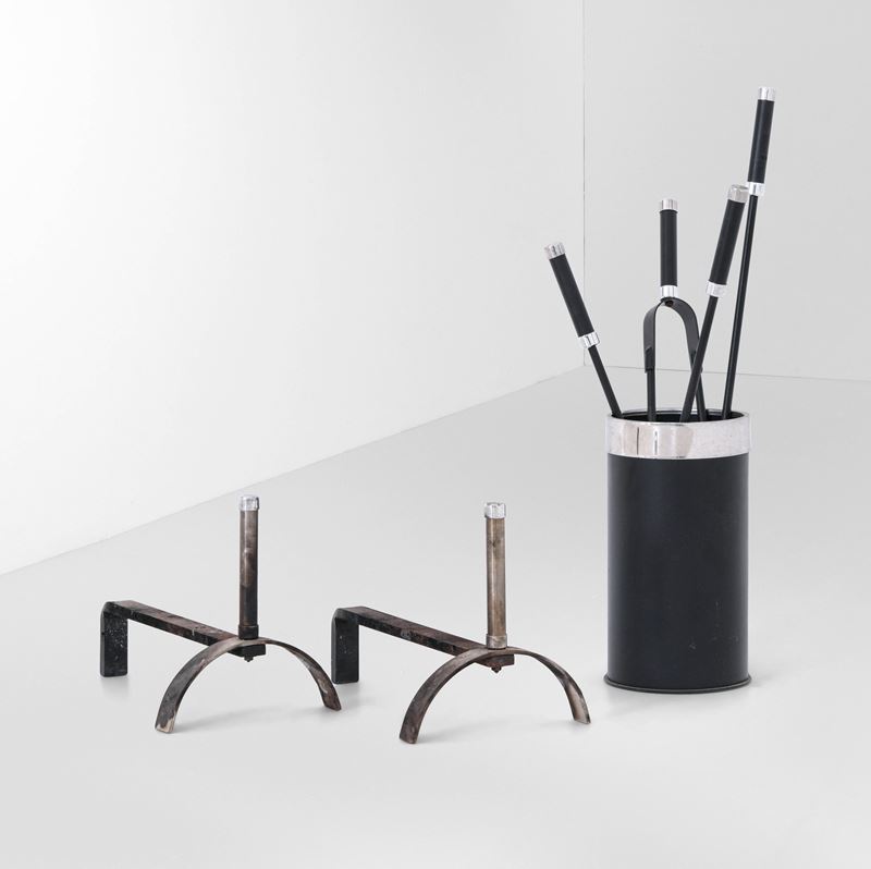 Gruppo di elementi composto da due alari, un contenitore e quattro strumenti.