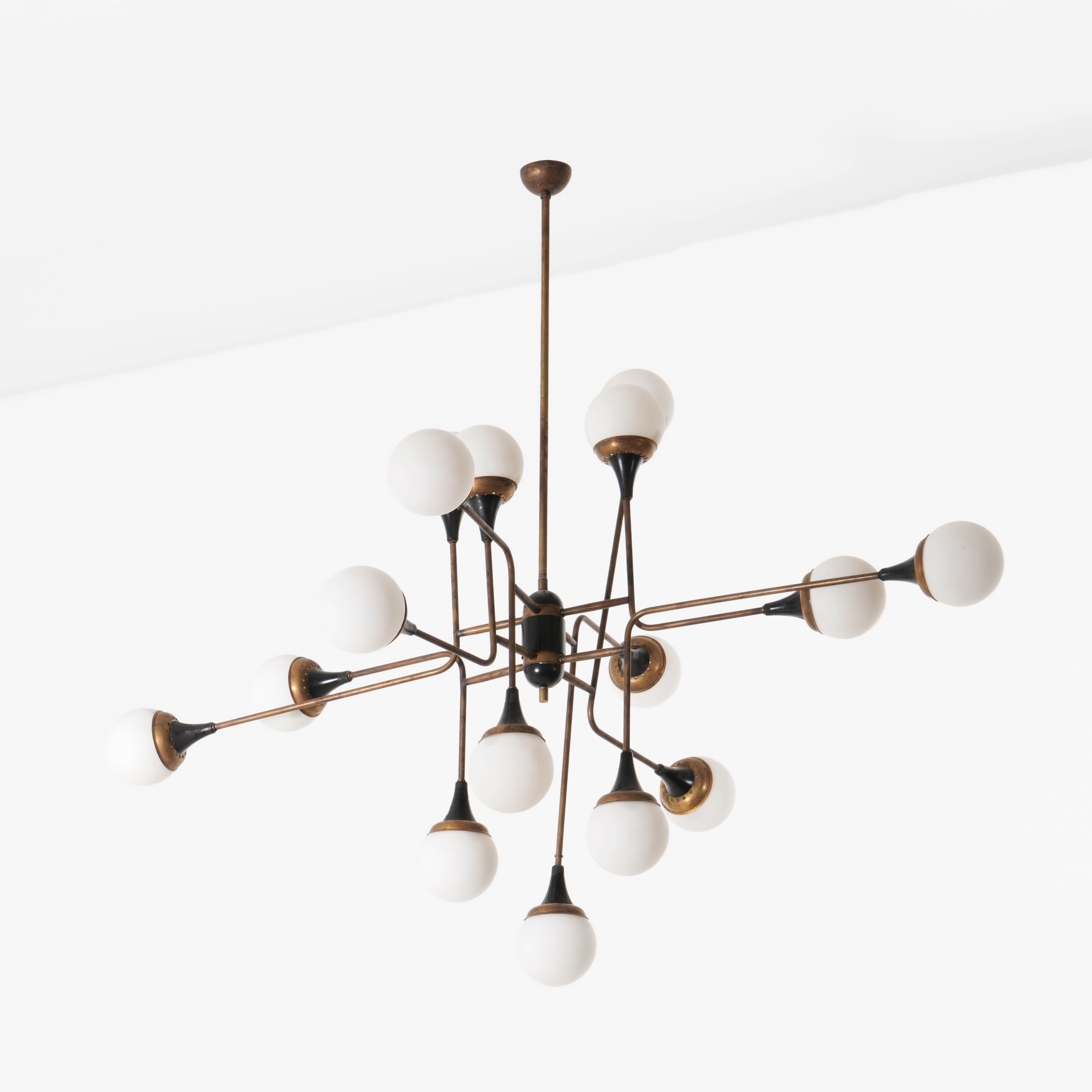 Struttura in ottone e ottone laccato. Diffusori in vetro opalino.