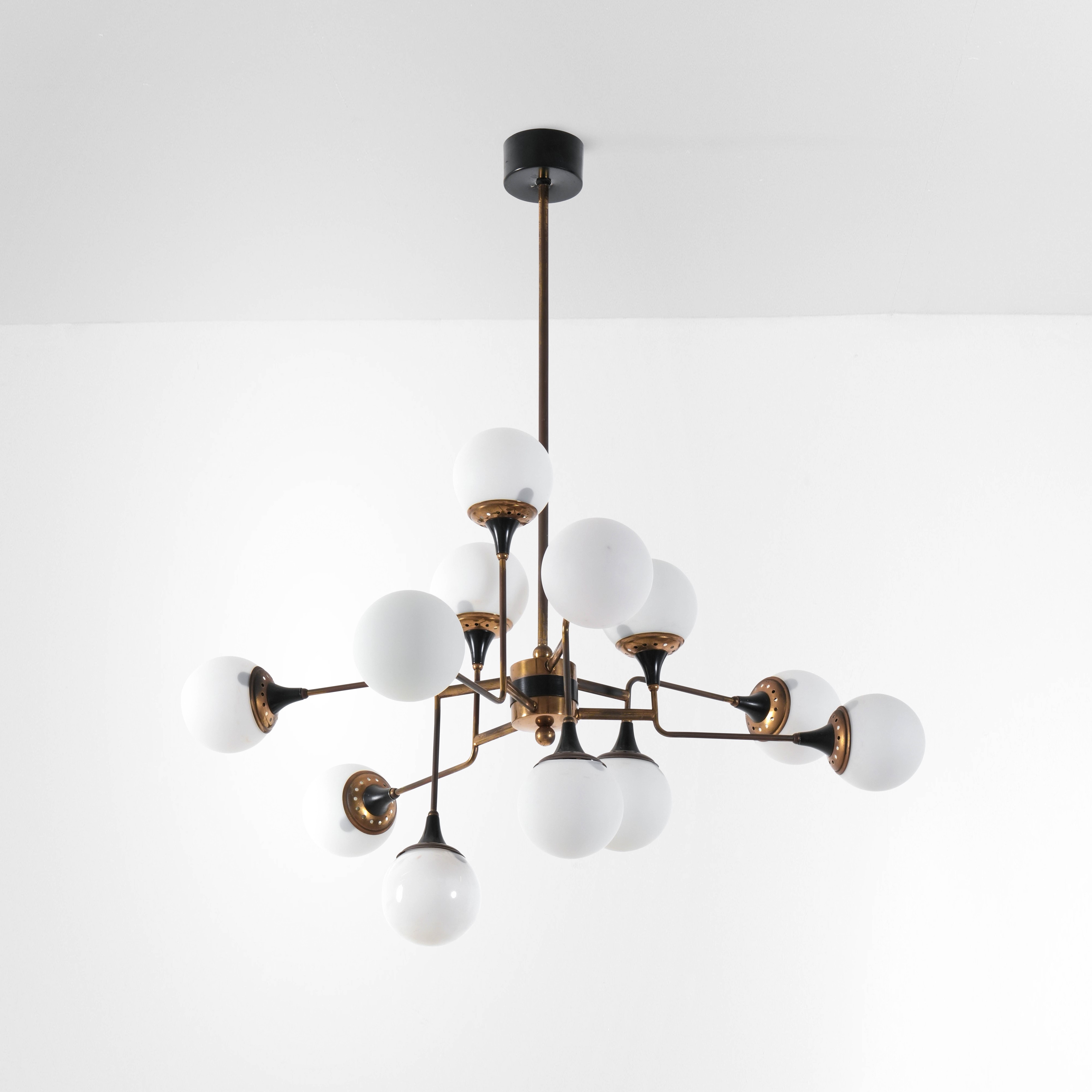 Struttura in ottone, metallo laccato e diffusori in vetro opalino satinato.