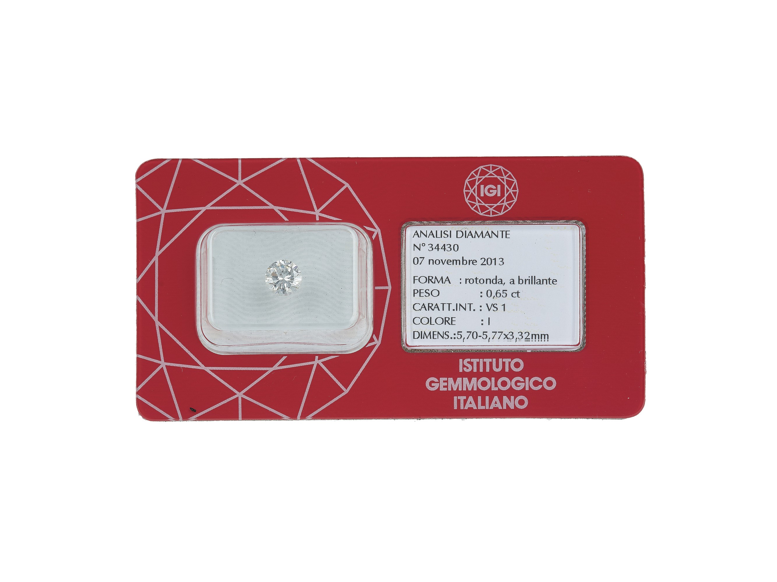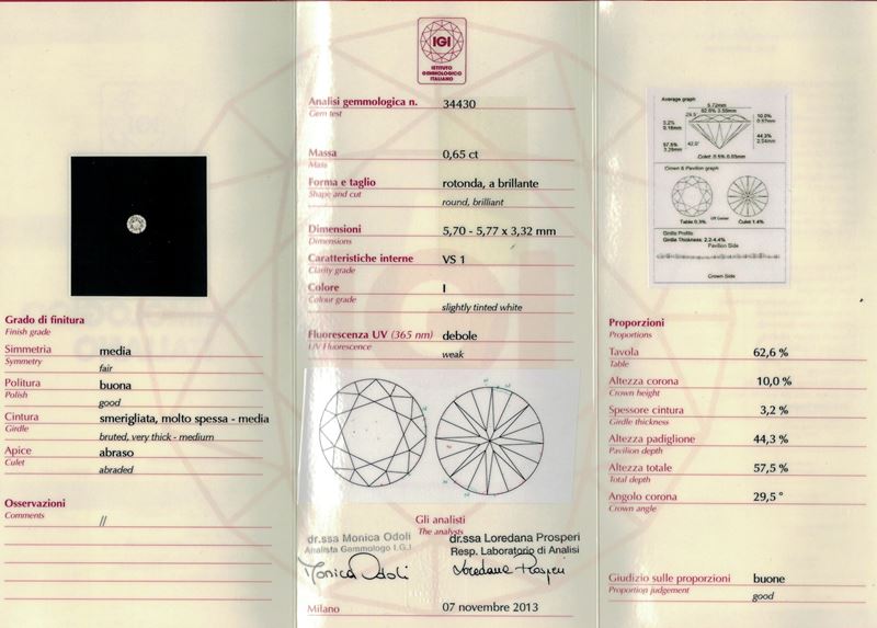 Brilliant-cut diamond weighing 0.65 carats, color I, clarity VS1, fluorescence weak. Gemmological Report IGI Milano n. 34430