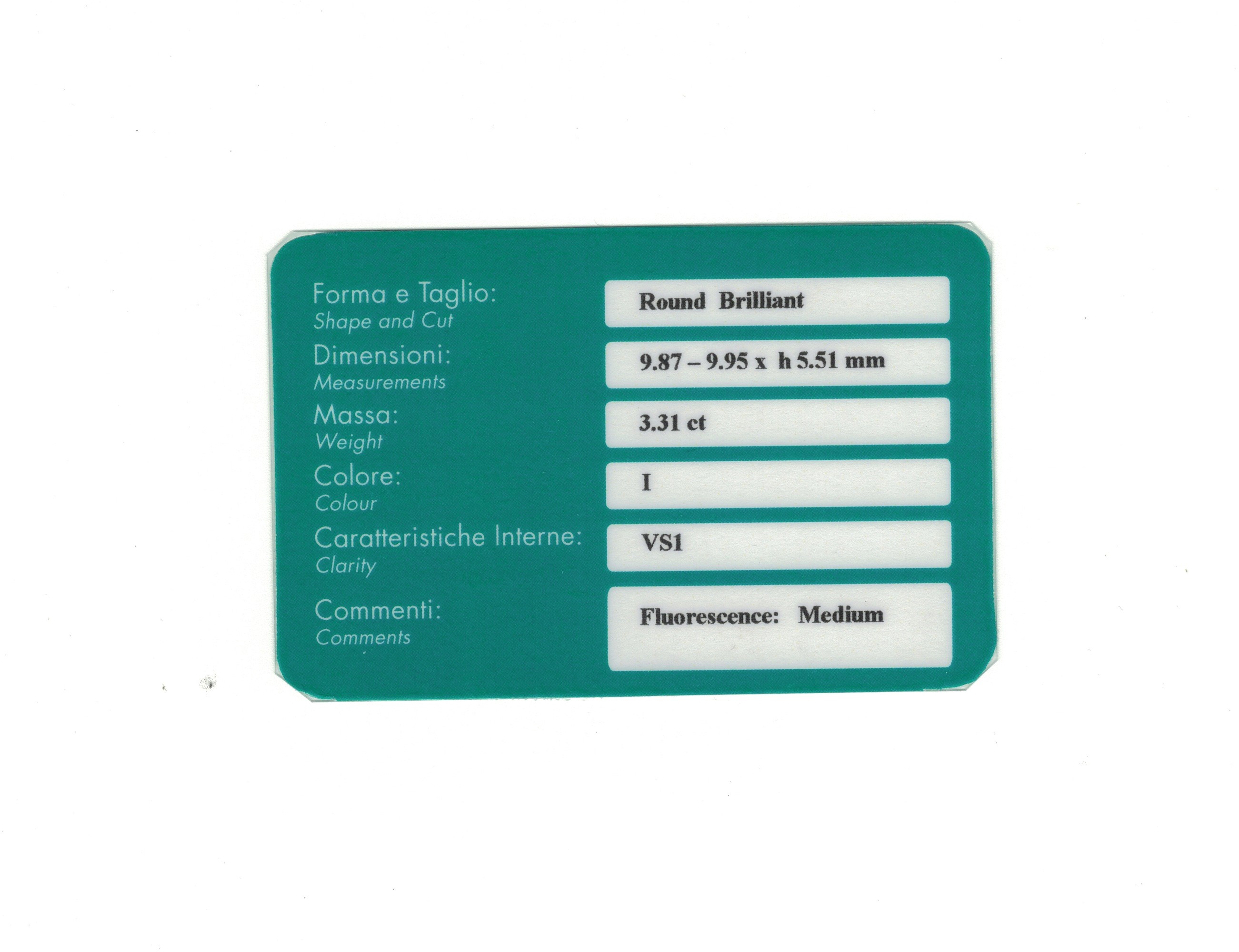 Brilliant-cut diamond weighing 3.31 carats, color I, clarity VS1, fluorescence medium. Gemmological Report R.A.G. Torino n. DV24097