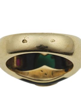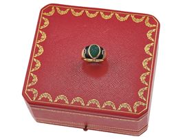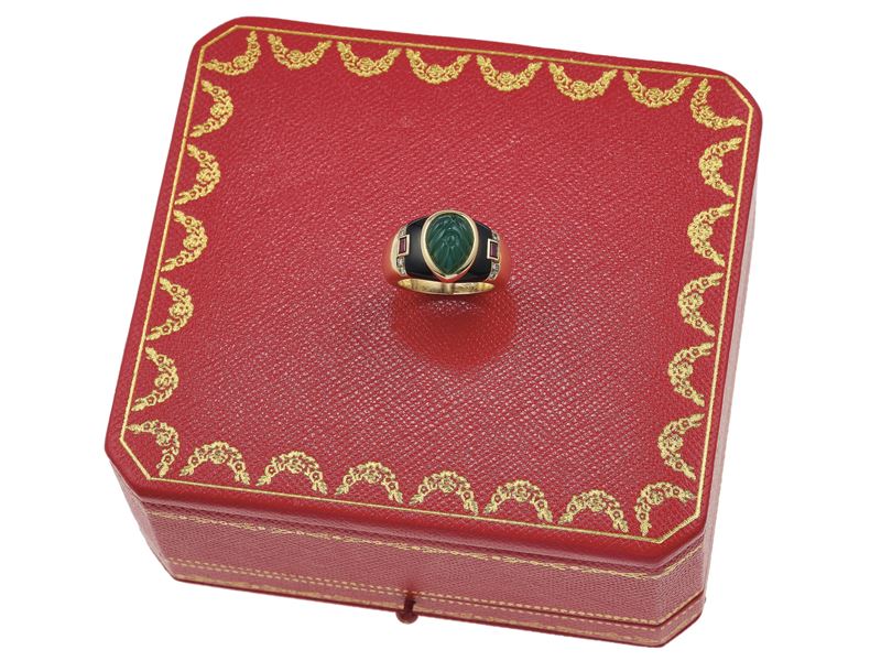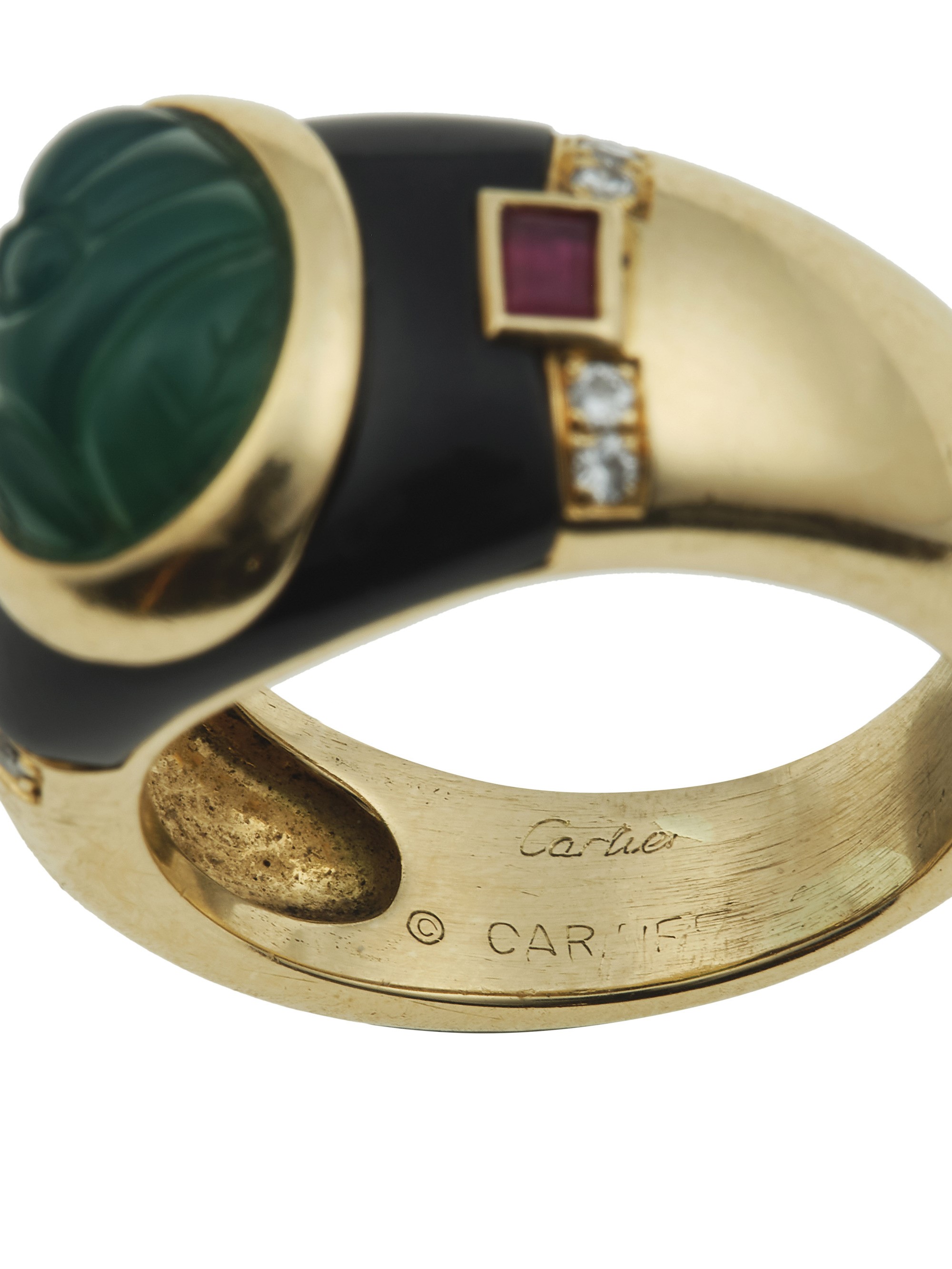 Chrysoprase, enamel, ruby and diamond ring. Signed and numbered Cartier 916792. Fitted case