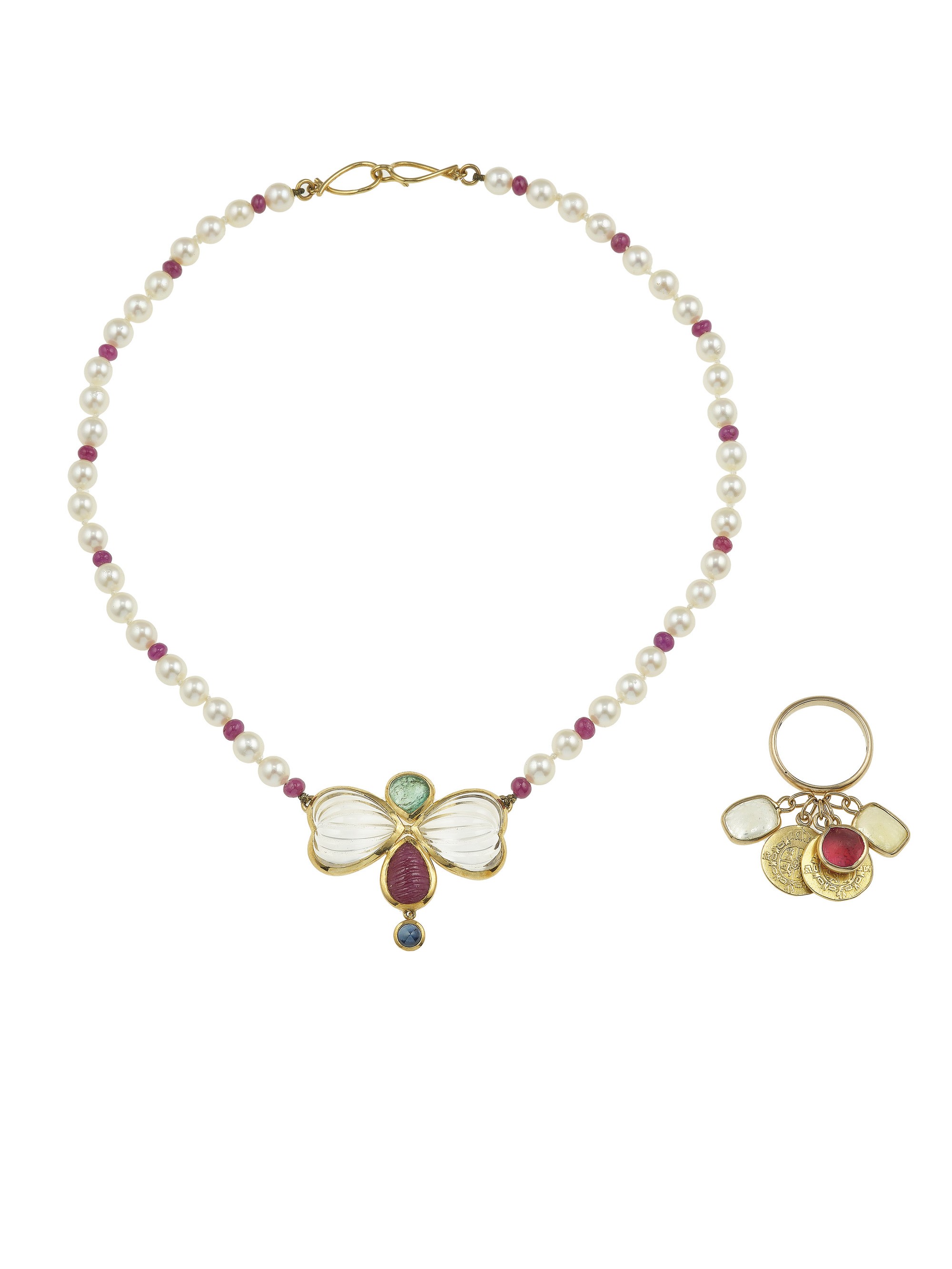 Cultured pearl and gem-set necklace and charms ring