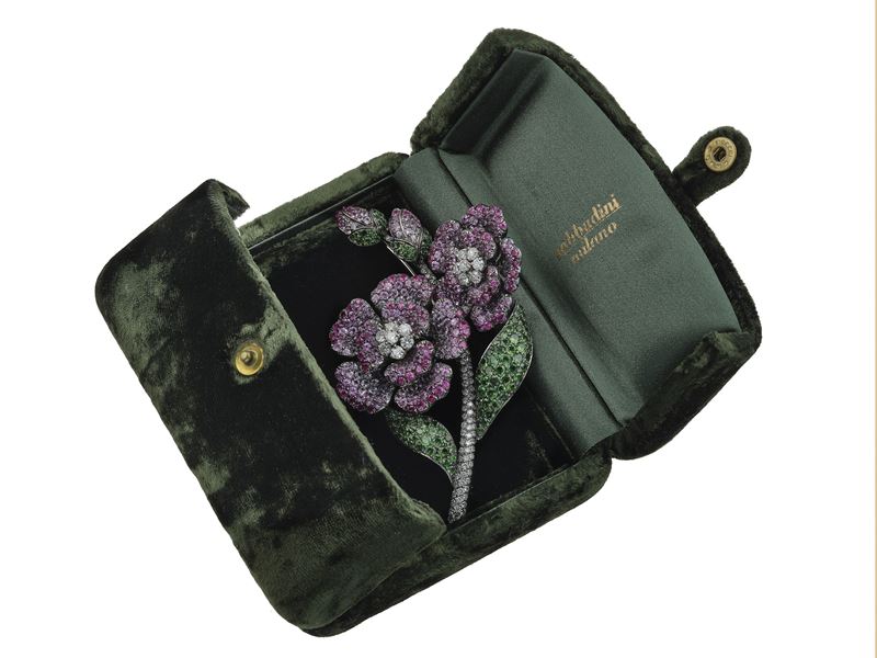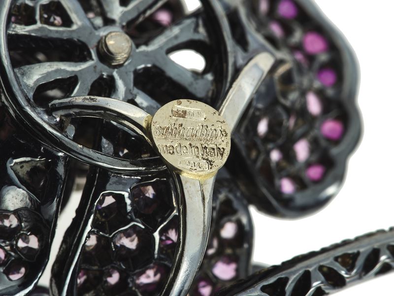 Diamond, pink sapphire, tsavorite and gold brooch. Signed Sabbadini