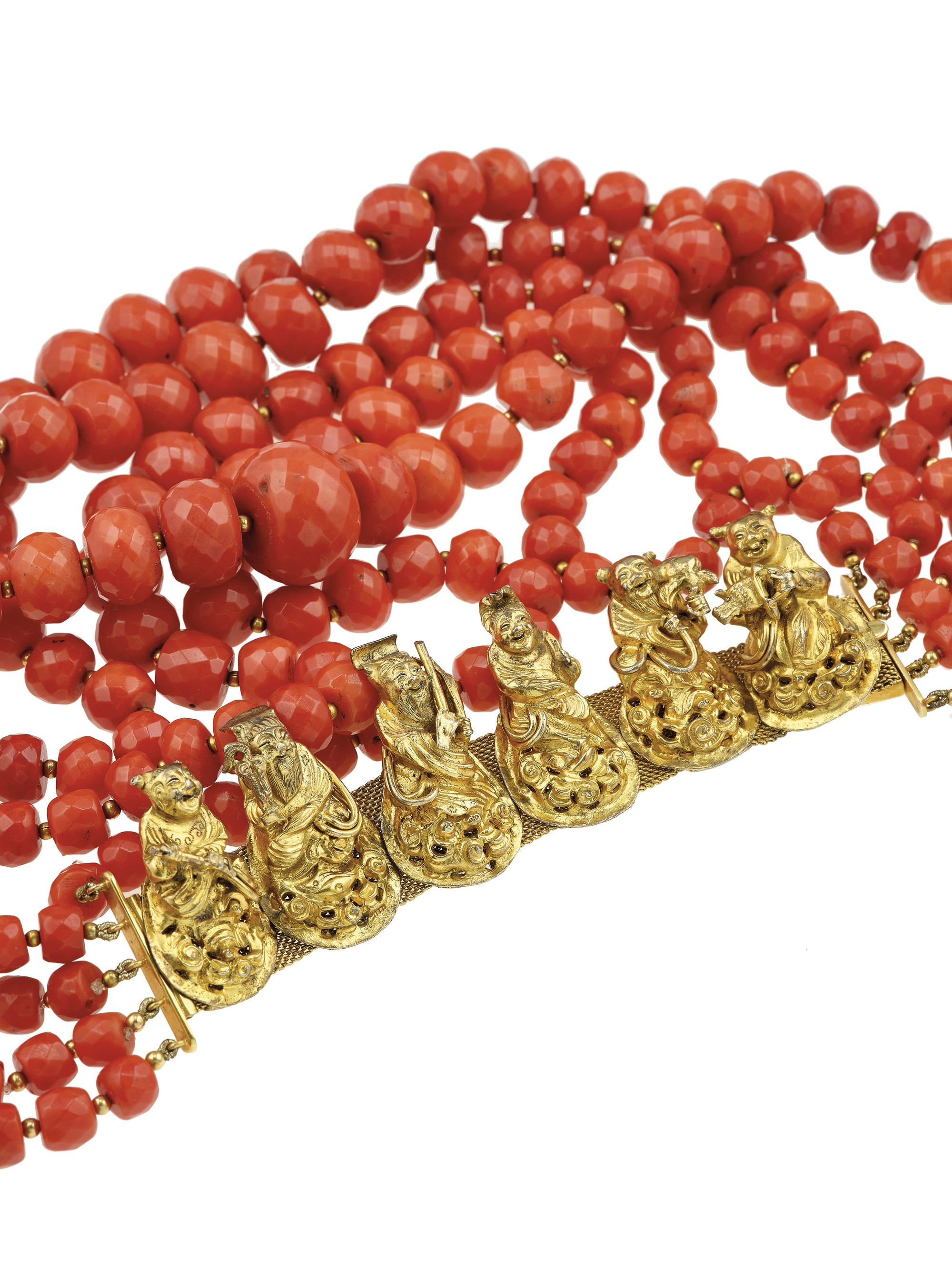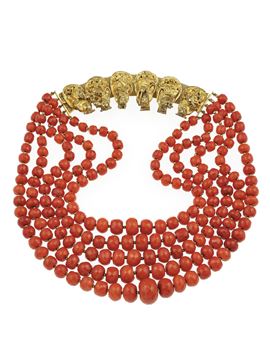 Five-strands of coral beads and gold necklace