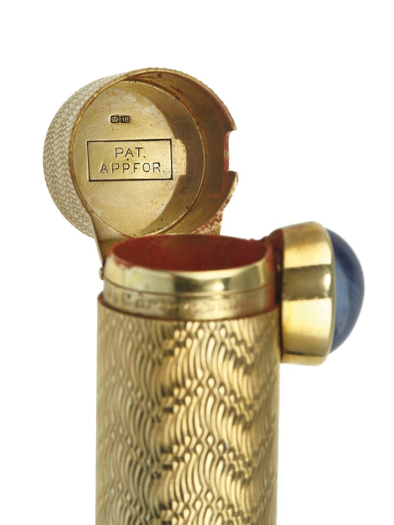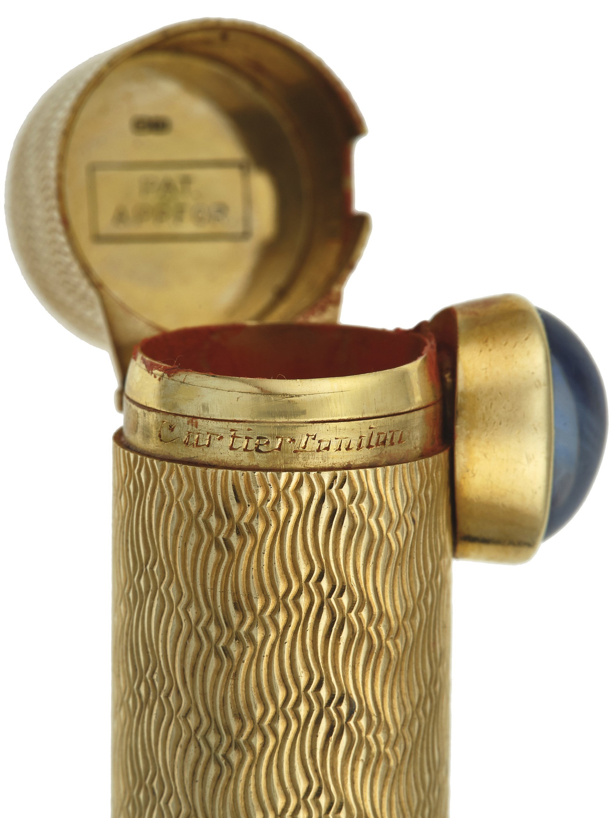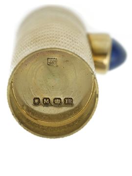 Gold and sapphire lipstick-case. Signed Cartier London. Mark: JC (Jacques Cartier)