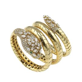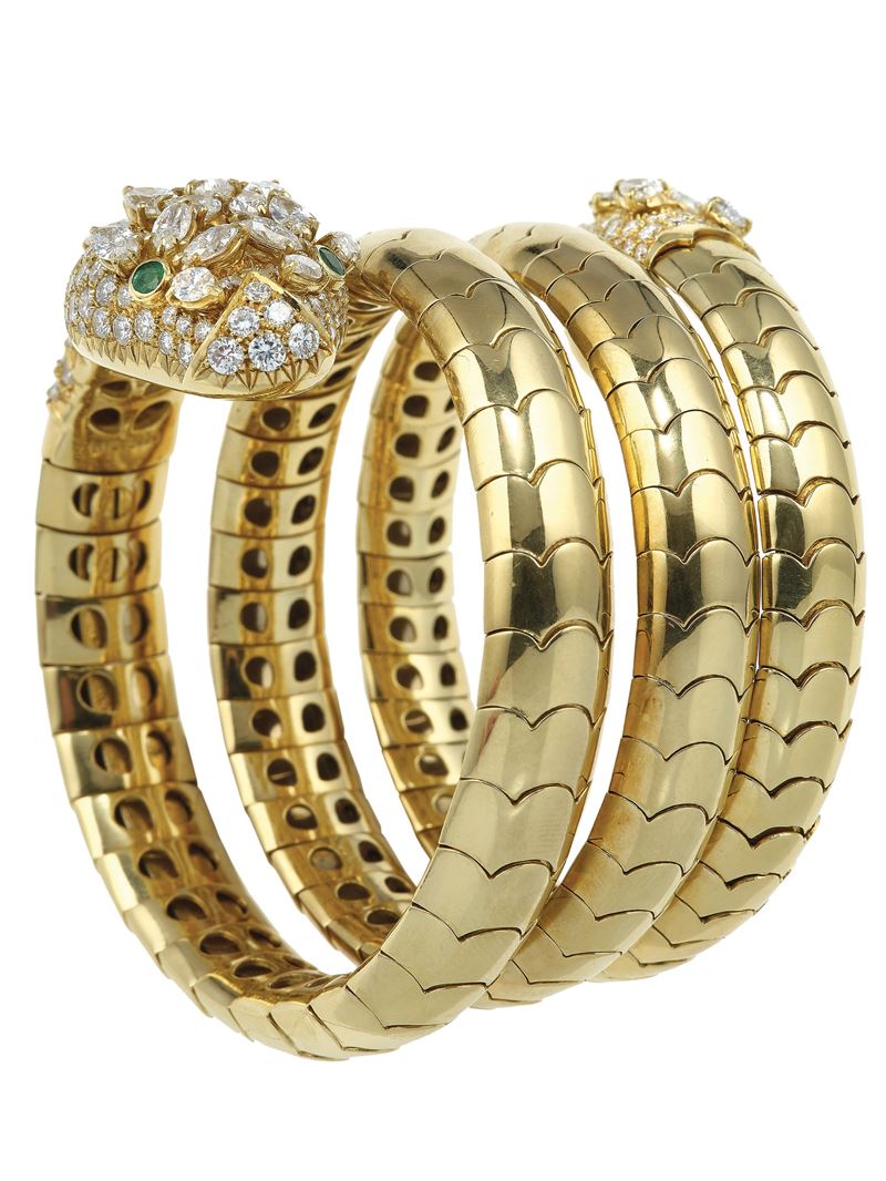 Gold, diamond and emerald "snake" bracelet. Signed Pederzani. Fitted case
