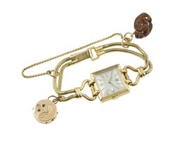 Gold lady's wristwatch with charms. The movement has not been tested for the accuracy of time and may need a service