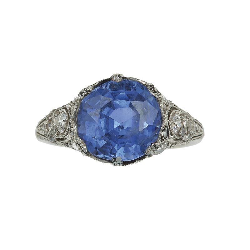 Sri Lanka sapphire weighing 5.07 carts and platinum ring. No indication of heating. Gemmological Report R.A.G. Torino n. C24025mn